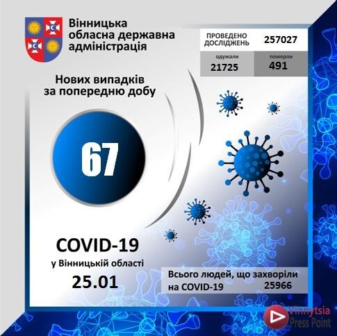 У Вінницькій області, станом на 25 січня, лабораторно підтвердили 25 966 випадків захворювання на COVID-19, від початку пандемії. Коронавірус вперше виявлили у 67 людей:
