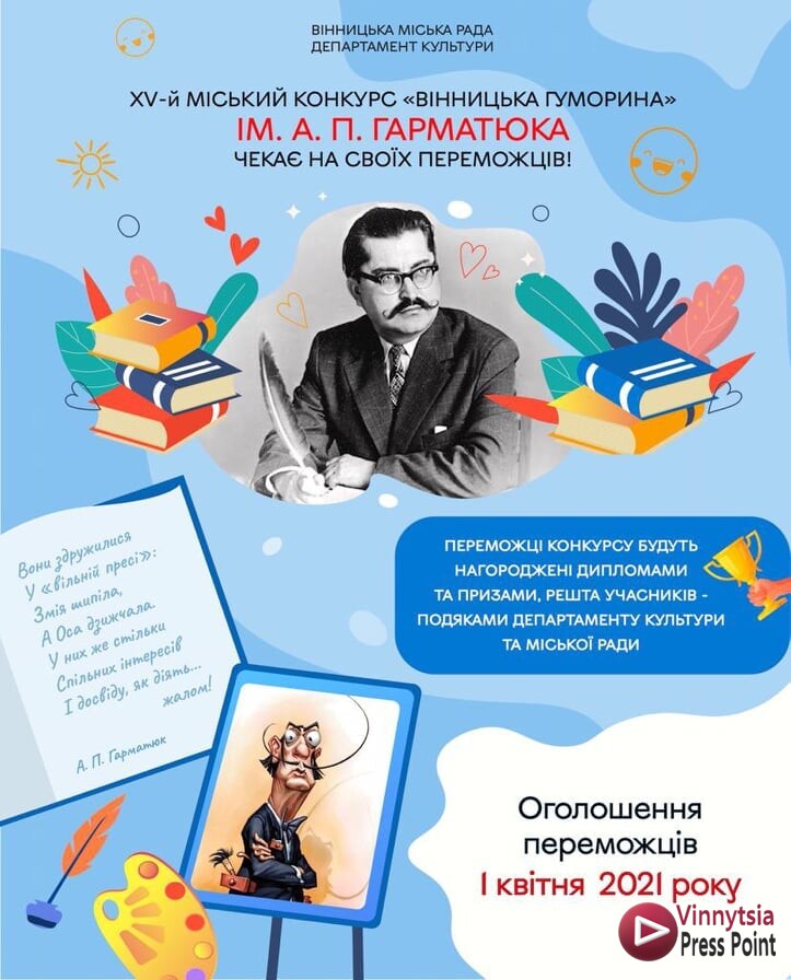 Конкурс сатири і гумору «Вінницька гуморина» ім. А.П.Гарматюка проводиться у місті 15 років поспіль. Цьогоріч, як і 2020-му, у зв’язку із пандемією коронавірусу конкурс проходитиме в онлайн-форматі на Культурному порталі міста «VinCulture Code».