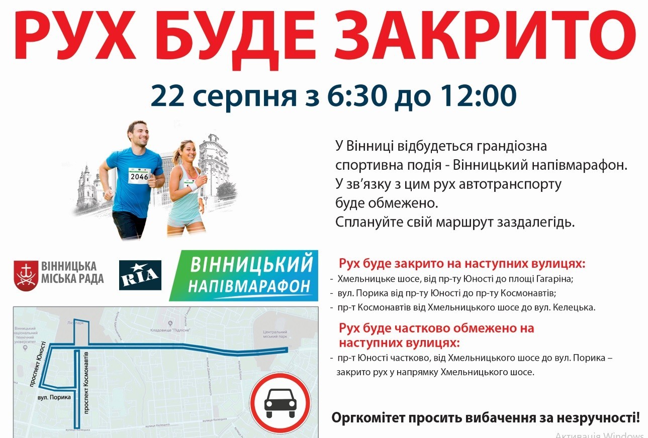 На час проведення півмарафону «Вінниця біжить», 22 серпня з 6:30 до 12:00, на вулицях міста буде тимчасово обмежений рух транспорту, а подекуди й перекритий на час пробігу спортсменів.