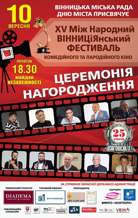 «На майдані Незалежності відбудеться урочиста церемонія нагородження. Головна нагорода фестивалю – «Золотий Летючий Слон», авторство якої належить нашим давнім партнерам – ювелірній компанії «Діадема». Ведучими запрошені Віктор Андрієнко, Василь Бендас та Валентин Опалєв. До них приєднаються дует «Володимир і Великий» (Вар’яти шоу), Аркадій Гарцман, Лесик Сам, Олег Філімонов, Ян Левінзон та Євген Чепурняк. А під кінець церемонії нагородження для усі присутніх виступить гурт «Лесик і Карпо», – розповів координатор проєкту ВІННИЦІЯнський фестиваль комедійного і пародійного кіно Євген Майданик.
