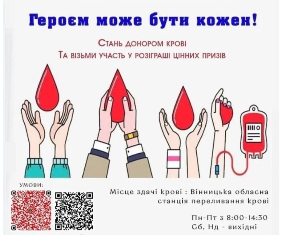 Вінничан запрошують долучитися до доброї справи та взяти участь у здачі крові. Кожен учасник акції «Героєм може бути кожен» може виграти цінні подарунки: бездротові навушники, сертифікат на 2000 грн та на 1000 грн.