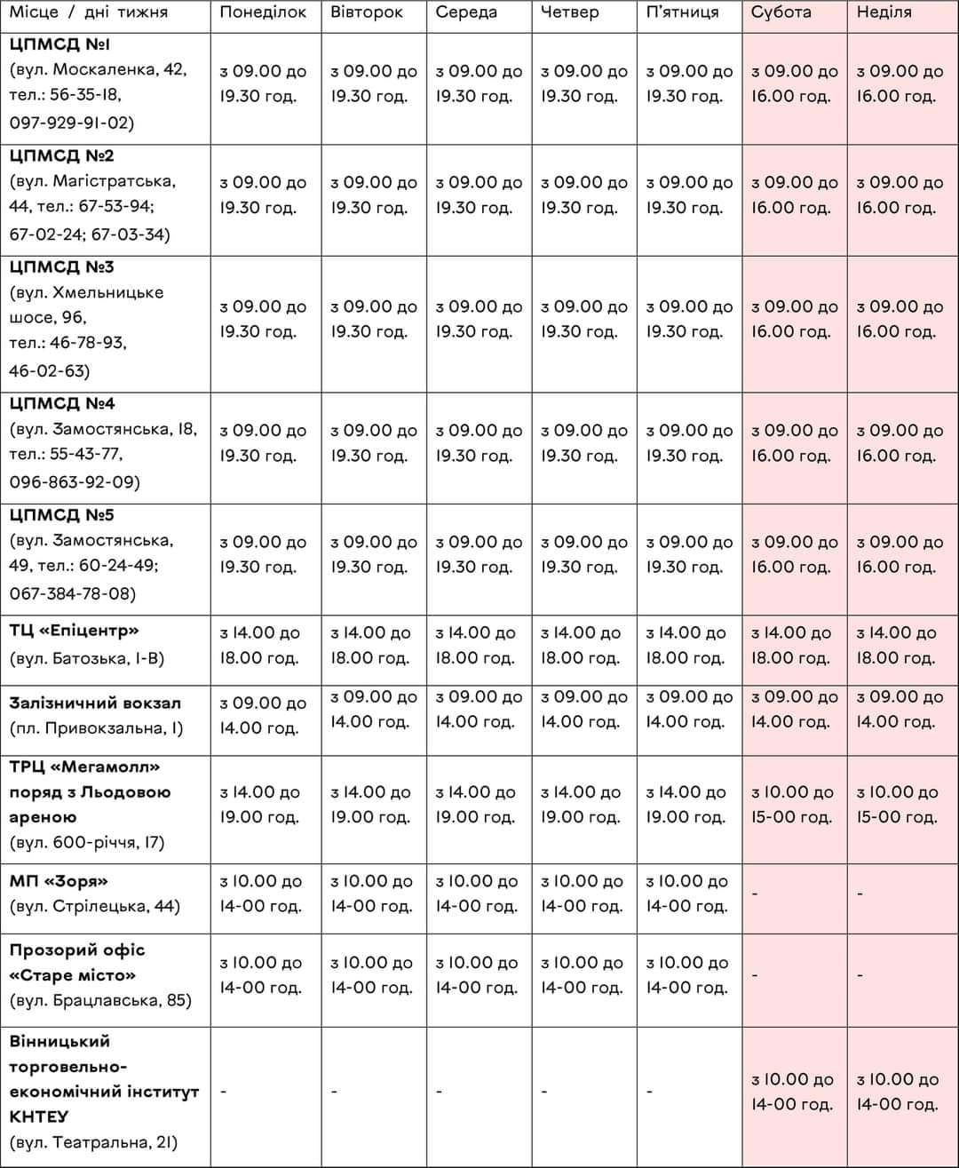 Головна НовиниНовиниУ Вінниці змінили графік роботи Центрів вакцинації населенняВід Редакція - 25.10.2021За інформацією Департаменту охорони здоров’я Вінницької міської ради, з 25 по 31 жовтня 2021 року Центри вакцинації населення у м. Вінниці працюватимуть у наступному режимі: