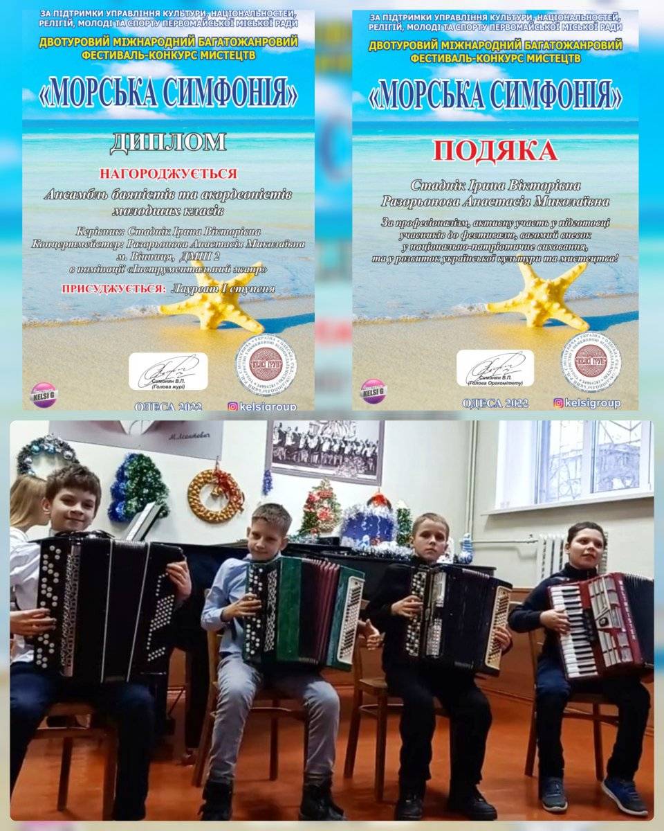 Вихованці Вінницької дитячої музичної школи №2, у складі ансамблю баяністів та акордеоністів молодших класів стали лауреатами першої премії Міжнародного двотурового багатожанрового фестивалю-конкурсу мистецтв “Морська симфонія” (м. Одеса). Цьогоріч він проходив дистанційно, а не як зазвичай у Літньому театрі поблизу вулиці Дерибасівська.