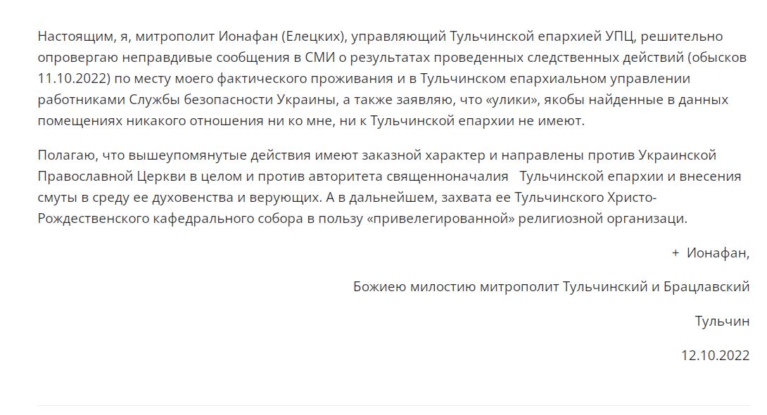 Митрополит Іонафан оприлюднив спростування на дії СБУ на офіційному сайті Тульчинської єпархії. В ньому священнослужитель заперечує усі обвинувачення.