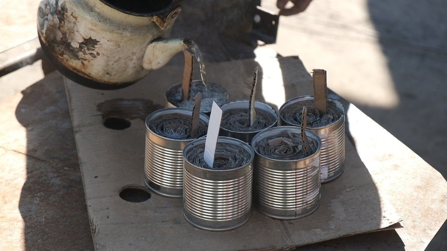 Як розповідає капелан, загалом у Грижинцях окопні свічки виготовляють десятеро колишніх безпритульних. Картон ріжуть на смужки, скручують ребристою стороною догори та вкладають у банку. Далі розтоплюють віск і заливають у форми, застигнути все має за кілька годин. Горять такі свічки до семи годин, їх передають місцевим волонтерам, а ті вже везуть на фронт.