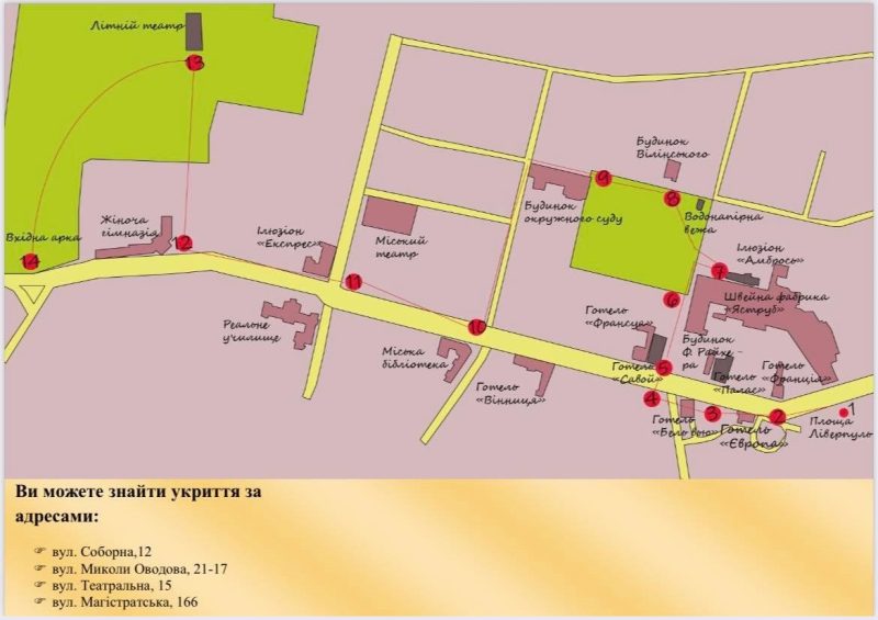 Отож, щоб скористатися аудіогідом, потрібно придбати у касі музею путівник (вартість – 120 грн), просканувати QR-код та перейти за посиланням у додаток Телеграм. Там висвічується перелік з 14 локацій: 1) площа Ліверпуль (старт екскурсії), 2) готелі «Франція» та «Європа», 3) готель «Палас» та будинок Райхера, 4) готелі «Савой», «Франсуа», 5) готель «Бель В’ю», 6) взуттєва фабрика «Яструб», 7) ілюзіон «Амбрось», 8) Вежа, садиба Вілінського, площа Європейська, 9) окружний суд, 10) готель «Вінниця» та бібліотека ім. М. Гоголя, 11) ілюзіон «Експрес», театр, реальне училище, 12) жіноча гімназія, 13) літній сад і театр, 14) Калічанська площа (фініш біля центральної арки в парк).