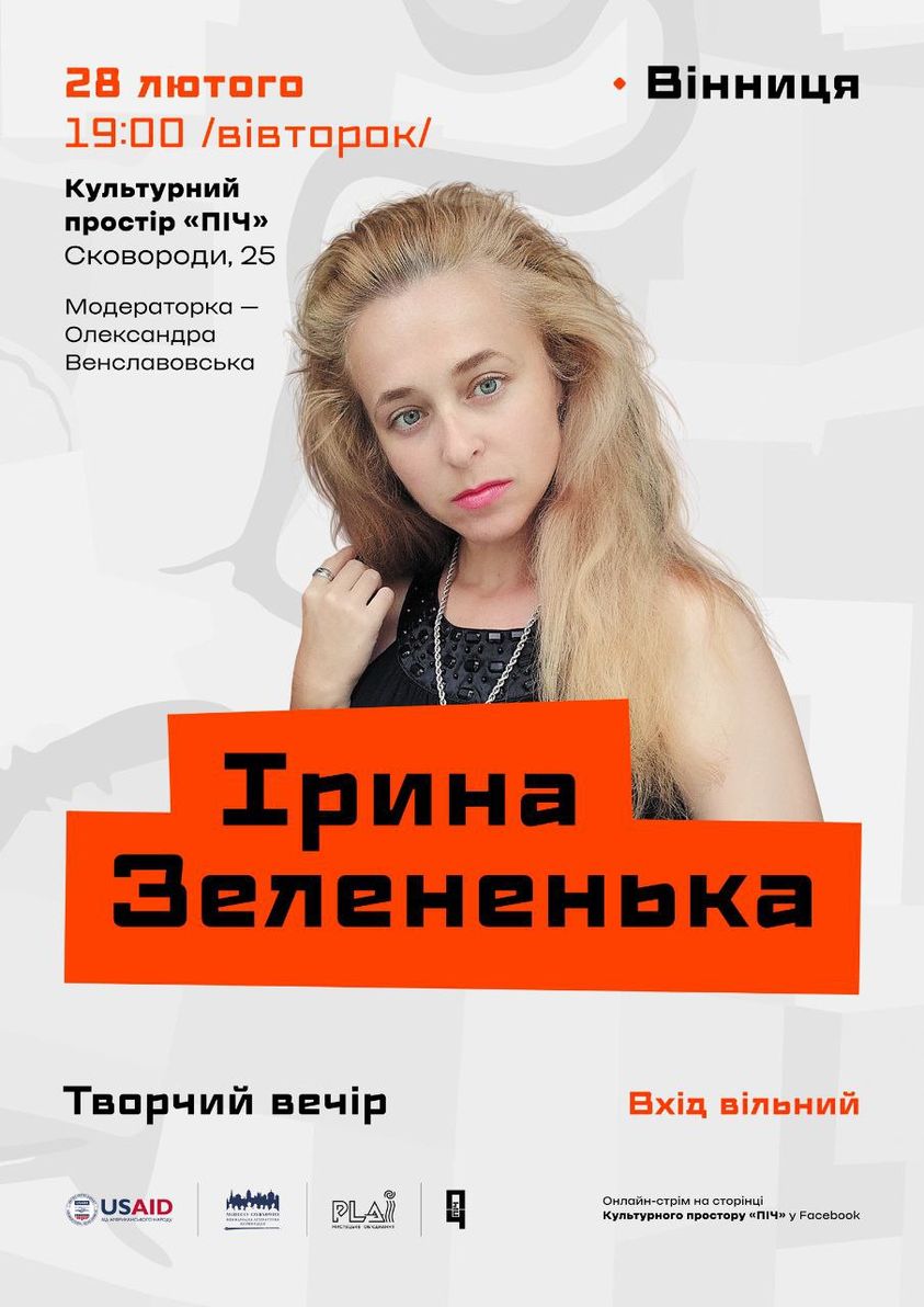28 лютого о 19:00 в культурному просторі ПІЧ відбудеться літературний вечір – читання та розмова за участі вінницької письменниці, літературознавиці Ірини Зелененької. Як і чому маленька жінка пише вірші про війну чи, радше, про героїв? Із вірою в нашу велику перемогу. Що дає їй сили? Любов.