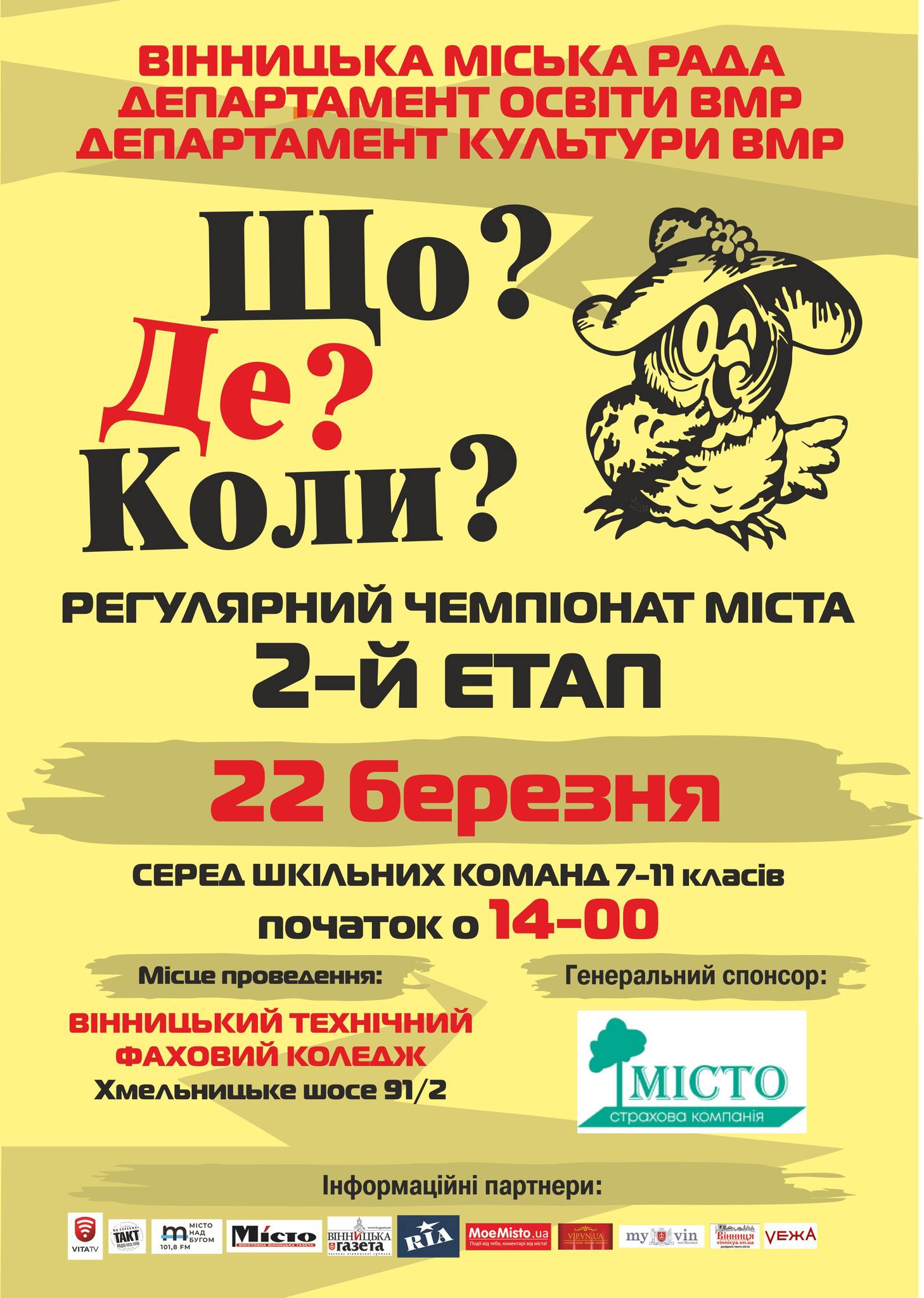 У Вінницькому технічному фаховому коледжі (Хмельницьке шосе, 91/2) 22 березня о 14:00 відбудеться ІІ етап чемпіонату міста з гри «Що? Де? Коли?» на призи міського голови, сезон 2022-2023 рр.