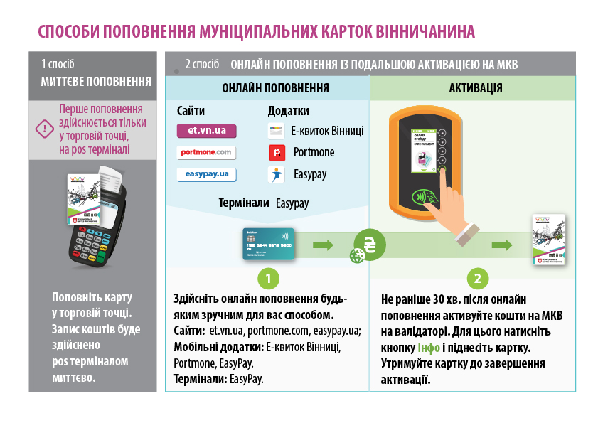 Варто зазначити, що поповнювати гаманці можна лише через термінали, а отримати доступ до проїзду онлайн можна лише на сайті. Рекомендується активувати поповнення наступного дня після здійснення оплати. Для цього треба на валідаторі натиснути кнопку “Інфо” та привести картку до зчитувача.