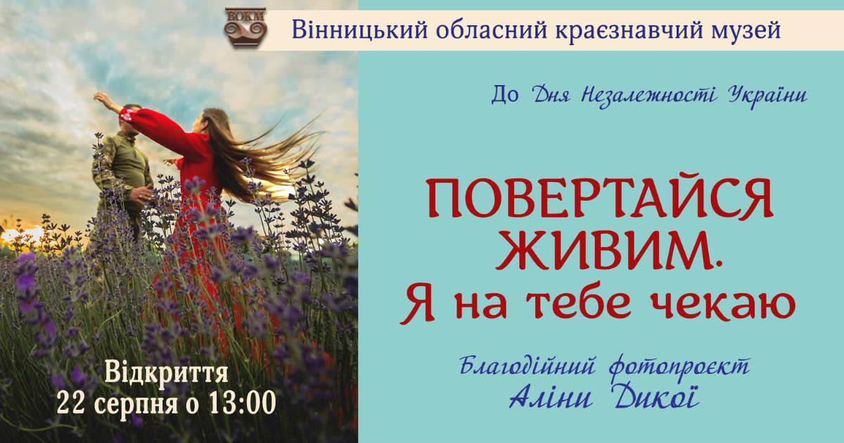 У Вінницькому обласному краєзнавчому музеї завтра, 22 серпня, відбудеться відкриття благодійного фотопроєкту Аліни Дикої «Повертайся живим. Я на тебе чекаю».
