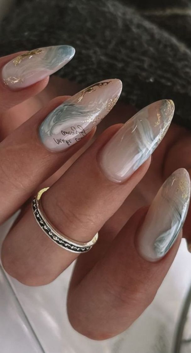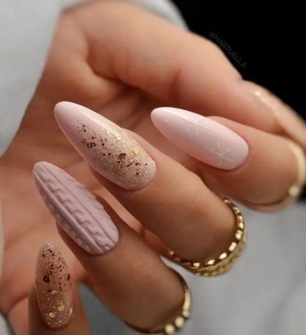Для такого манікюру ідеально підійде база світлих тонів із додаванням фольги, блискіток і розсипу кількох камінців. Цей декор нігтів пасуватиме як до свят, так і в будні.