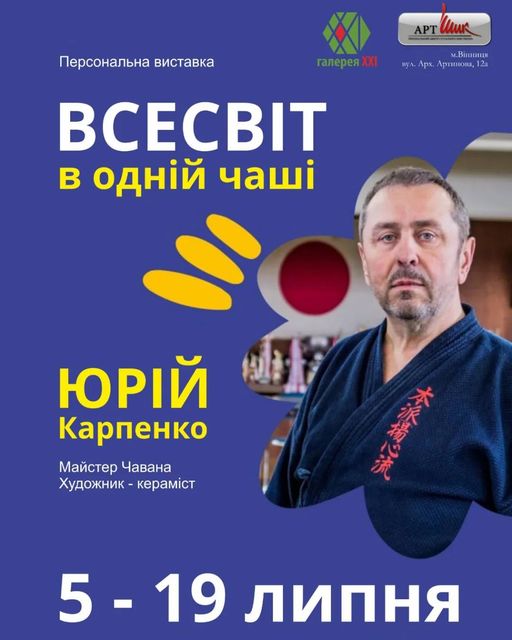 Юрій Карпенко — ГУРУ з виготовлення кераміки за унікальною японською технологією “раку”, що відома своїми неймовірними ефектами глазурі, які нагадують дивовижні простори Всесвіту з міріадами зірок і осяянням Галактик. У рамках виставки будуть представлені не лише керамічні твори, а й живопис майстра, який доповнює його творчий образ.