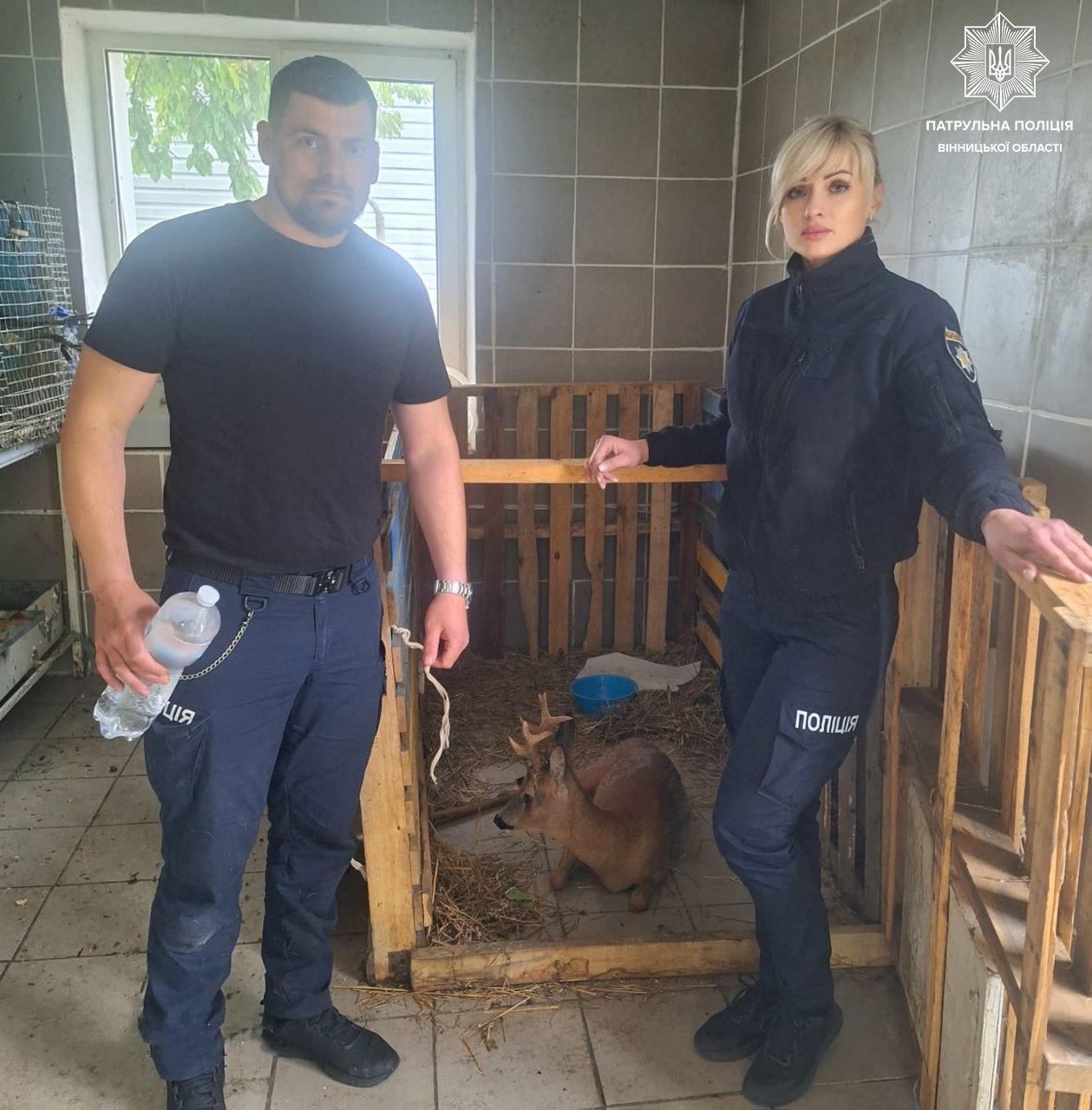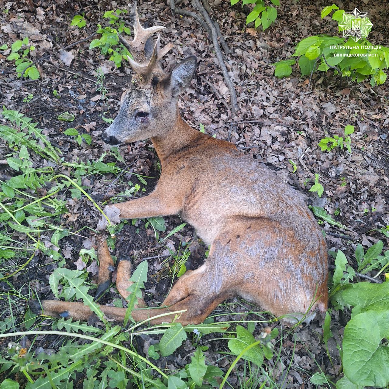 Інспектори патрульної поліції Дмитро Лебедовський і Катерина Кордон під час несення служби на об’їзному шосе біля Вінниці помітили поранену тварину. Налякана козуля лежала просто біля дороги — з переламаною ногою вона була знесилена й не могла рухатися.
