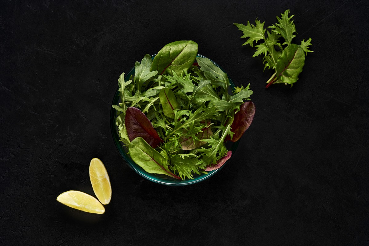 У великій мисці змішайте листя шпинату, руколу та салату.