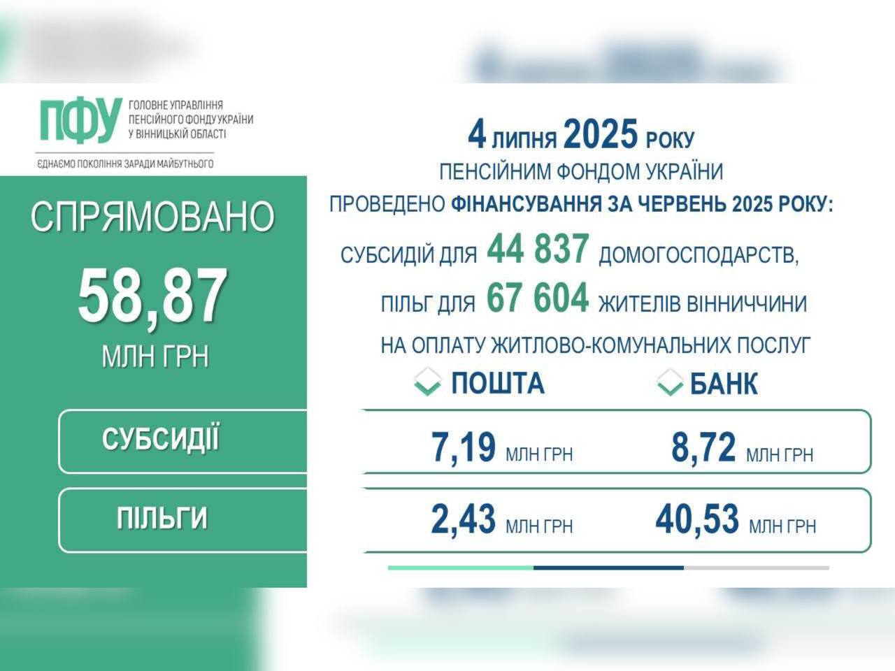 4 липня Пенсійний фонд України перерахував кошти для надання субсидій і пільг мешканцям Вінниччини на оплату житлово-комунальних послуг, придбання твердого палива та скрапленого газу.