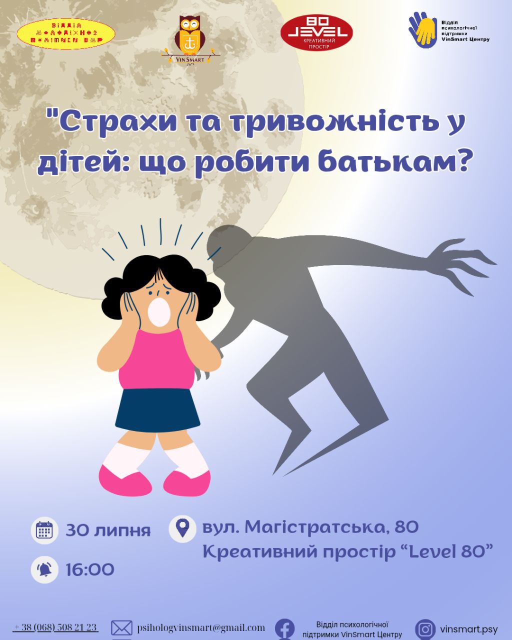 У середу, 30 липня, у Вінниці відбудеться семінар для батьків, присвячений темі страхів і тривожності у дітей. Захід розпочнеться о 16:00 у креативному просторі «LEVEL 80» (вул. Магістратська, 80). Про це повідомляють на сторінці Вінницької міської ради.