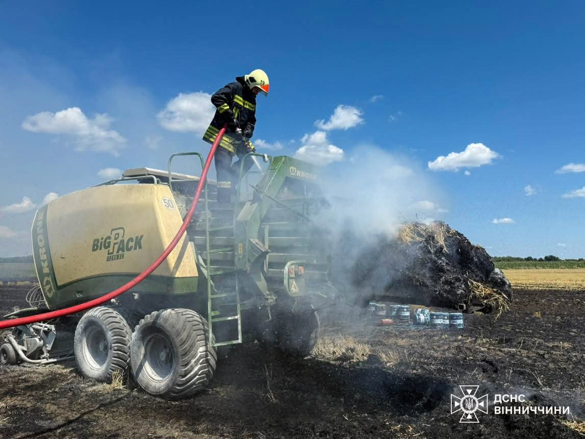 Ще один інцидент стався на полі поблизу села Забара Калинівської громади: через потрапляння стороннього предмета в механізм загорівся тюкопрес. Пожежа знищила стерню на площі 400 кв. м, однак завдяки злагодженим діям рятувальників вдалося вберегти техніку від повного знищення.