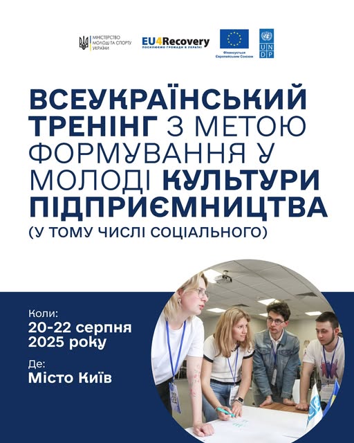 З 20 по 22 серпня 2025 року в Києві відбудеться Всеукраїнський тренінг, спрямований на формування у молоді культури підприємництва, у тому числі соціального, а також на посилення компетентностей у сфері підприємницької діяльності.