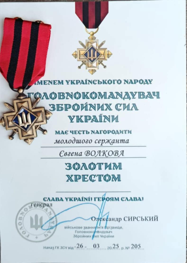 Молодший сержант 120-ї окремої бригади територіальної оборони ЗСУ Євген Волков з Вінниччини відзначений високою державною нагородою за службу та мужність «Золотим Хрестом» Головнокомандувача ЗСУ.
