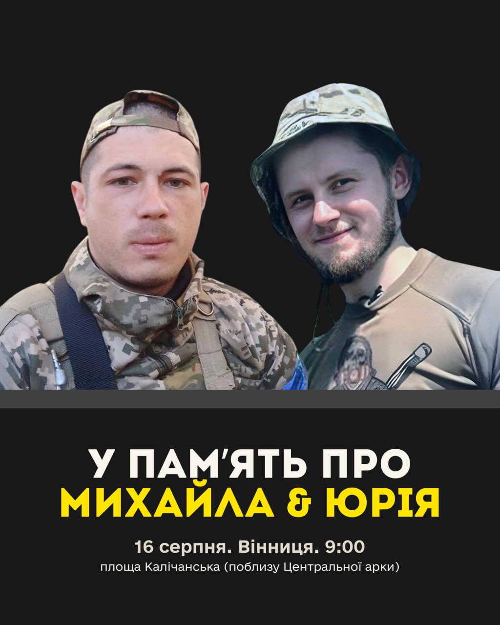 У суботу, 16 серпня 2025 року, у Вінниці відбудеться акція пам’яті, присвячена загиблим воїнам Михайлу Насадюку та Юрію Бурку. Михайло Насадюк служив у 59-й окремій штурмовій бригаді ім. Якова Гандзюка, а Юрій Бурко — у 14-й бригаді «Червона калина».