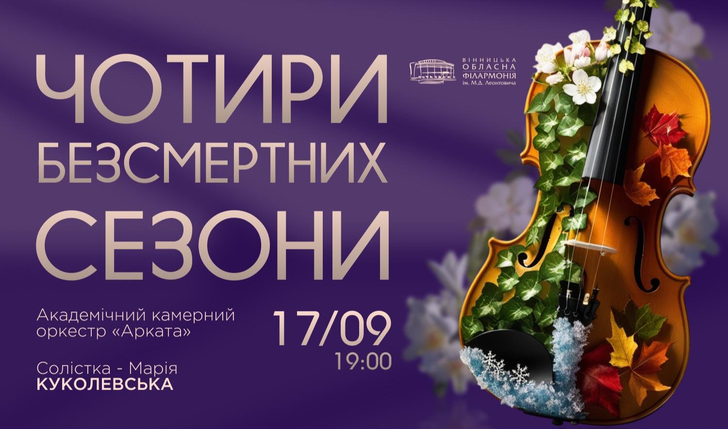 У Вінниці «Пори року» прозвучать у виконанні Академічного камерного оркестру «Арката». Солісткою вечора стане Марія Куколевська. Глядачі зможуть відчути весняну свіжість, літню грозу, осінню прохолоду та зимову величну стихію у межах концерту «Чотири безсмертних сезони».