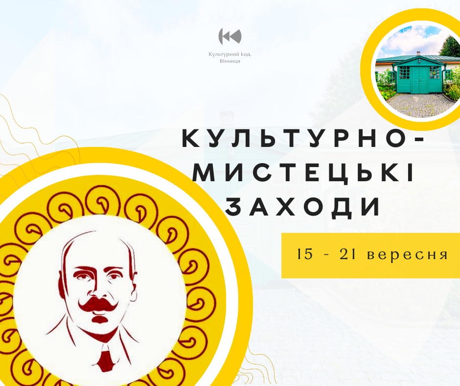 Вінничан та гостей міста запрошують долучитися до насиченої програми культурних подій, що триватимуть з 15 по 21 вересня. У місті пройдуть виставки, кінопокази, екскурсії, лекції, концерти та майстер-класи для дорослих і дітей.