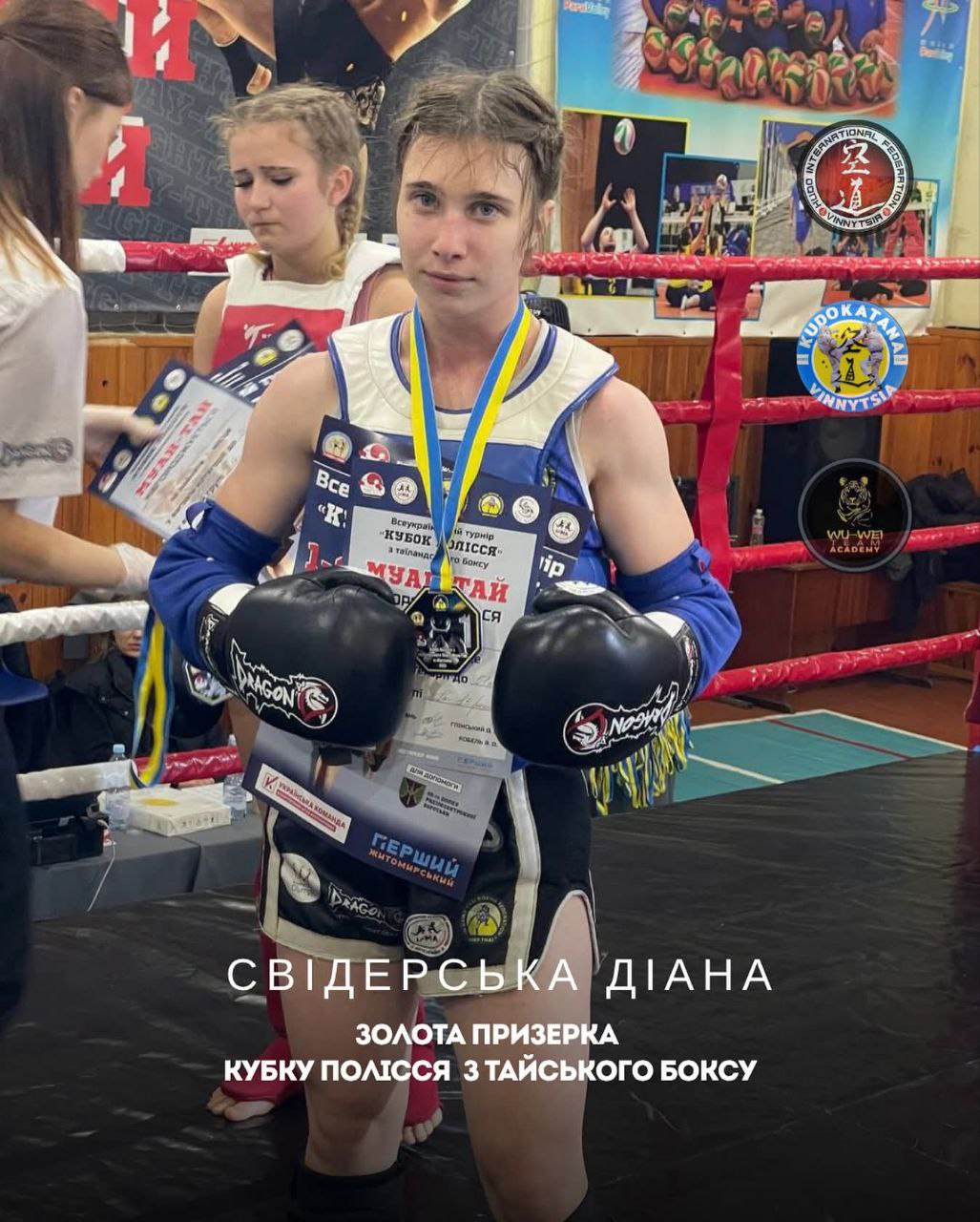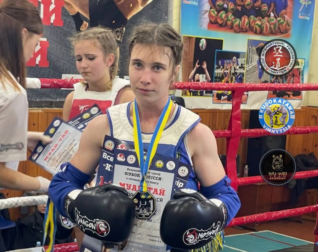 На фото — щаслива чемпіонка з медаллю, кубком і трьома грамотами, а за спиною — червоний кут рингу, що пам’ятає її блискавичні лоу-кіки та бездоганні клінчі.