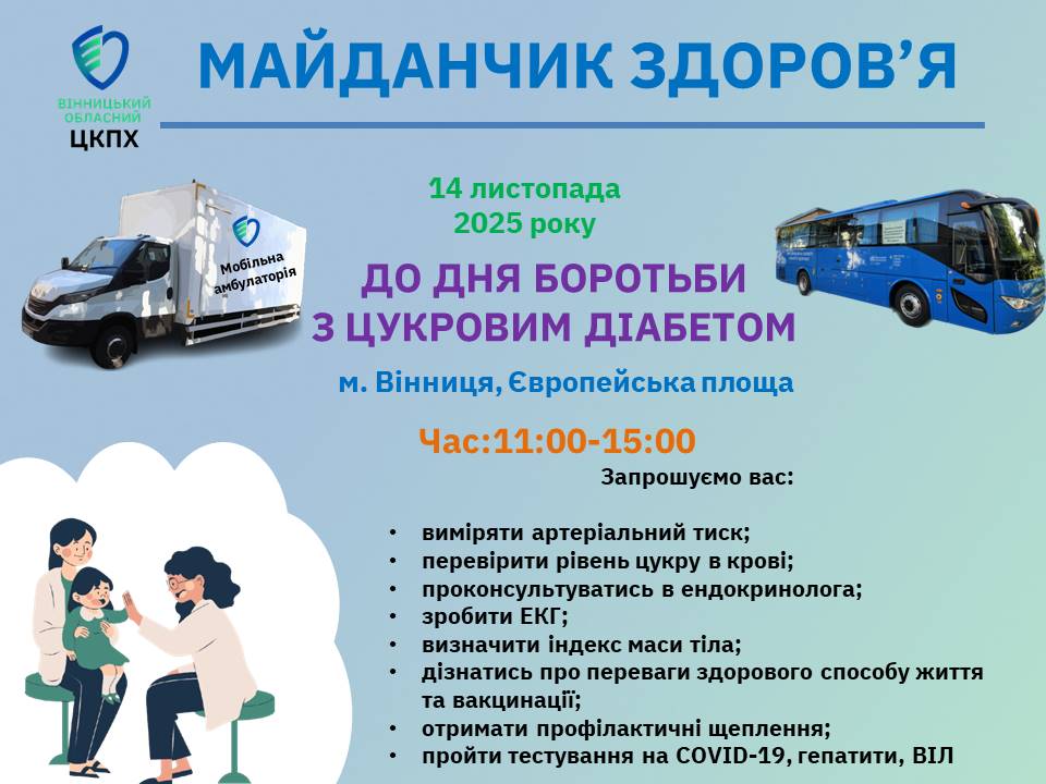 Сьогодні, 14 листопада, на Європейській площі у Вінниці працюватиме «Майданчик здоров’я», присвячений Дню боротьби з цукровим діабетом. Захід організовує Вінницький обласний ЦКПХ за участі мобільної амбулаторії та спеціального медичного автобуса.