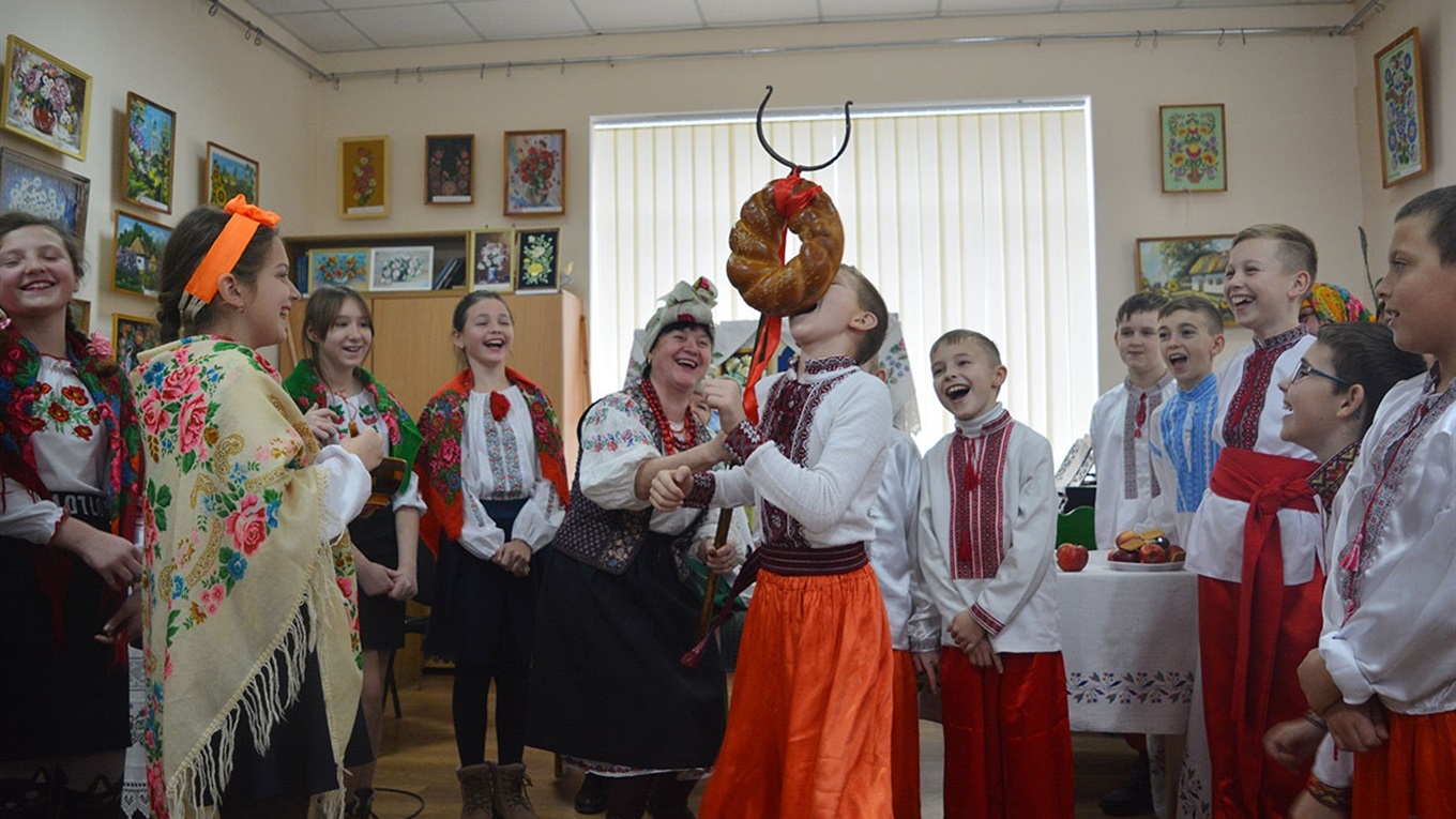 Хлопець-підліток або молодий парубок тримає калиту високо на рівні обличчя. Завдання іншого парубка — підскочити на одній нозі, не торкаючись землі другою, і відкусити шматок. Обличчя при цьому вимазують сажею, обсипають борошном, а глядачі щосили глузують. Хто відкусить найбільший шматок — тому й щастя на весь рік.