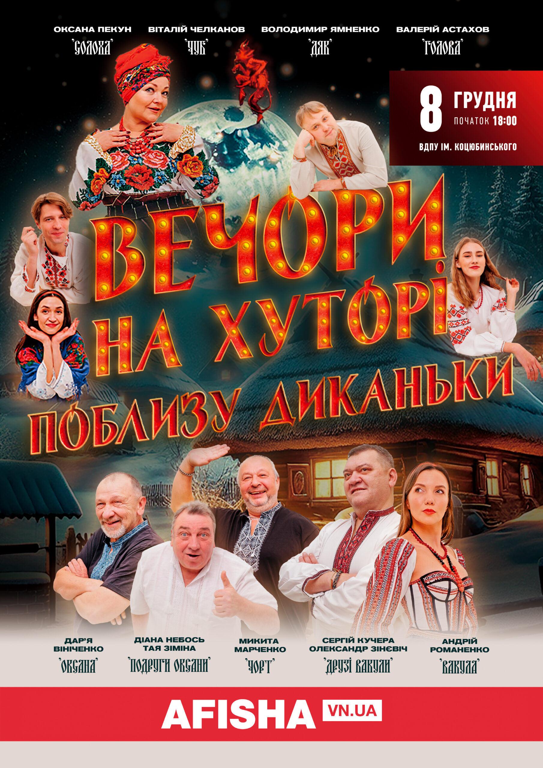 Уже в понеділок, 8 грудня о 18:00, у концертній залі Вінницького педагогічного університету на глядачів чекає яскрава музична комедія «Вечори на хуторі поблизу Диканьки» — колоритна, смішна та наповнена справжньою українською атмосферою.