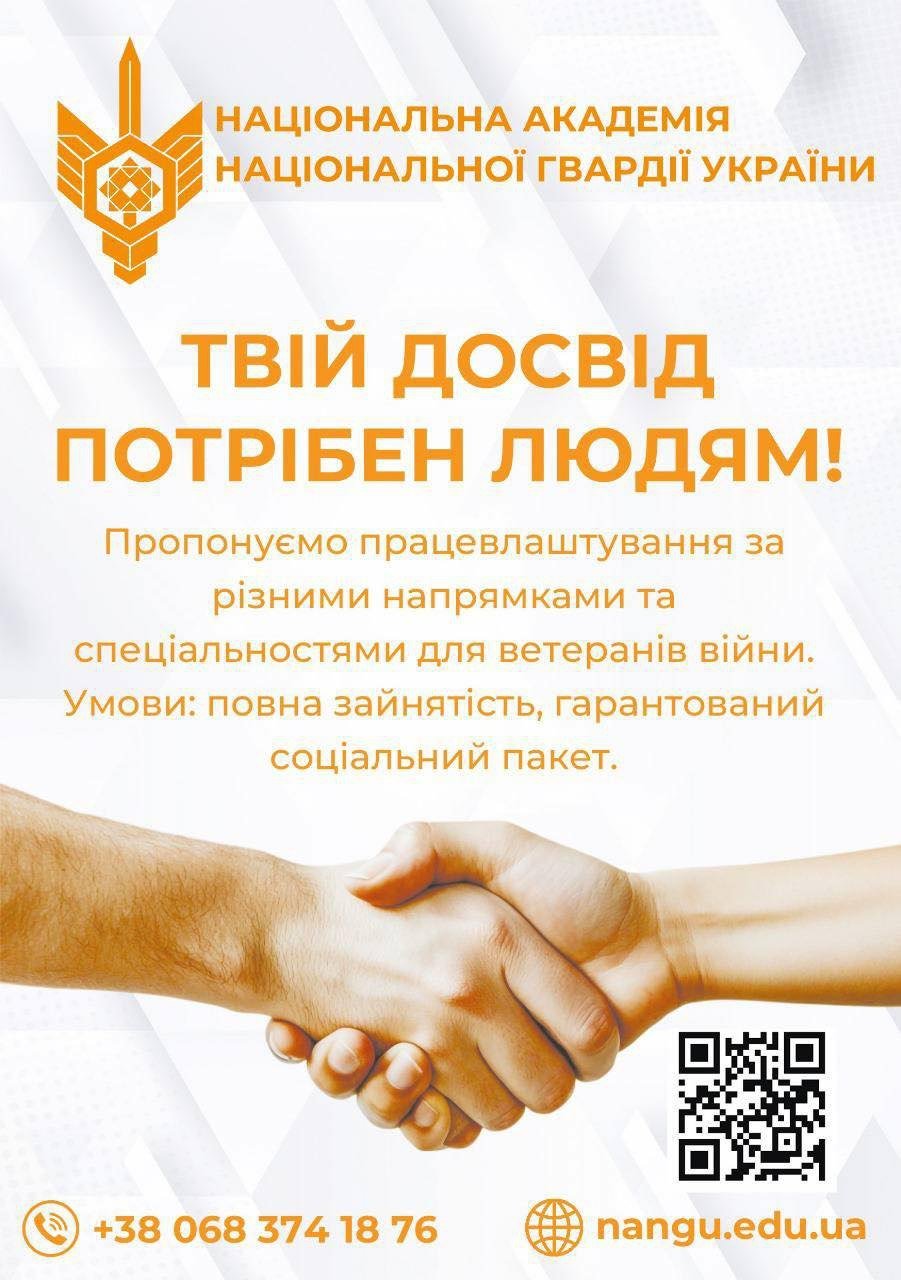 Національна академія Національної гвардії України оголосила набір ветеранів, які готові продовжувати служити суспільству та застосувати свій бойовий досвід у мирному середовищі. У закладі відкриті вакансії за різними напрямами та спеціальностями — від інструкторської роботи до адміністративних посад.