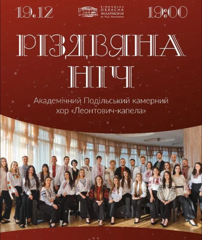 Вінницька обласна філармонія імені М. Д. Леонтовича запрошує вінничан та гостей міста 19 грудня на святковий концерт «Різдвяна ніч», який подарує атмосферу тепла, світла та справжнього різдвяного дива.