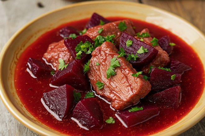 Залийте водою або бульйоном, накрийте кришкою й тушіть на повільному вогні 40–60 хвилин, доки м’ясо стане м’яким, а буряк — насиченим і ароматним.
