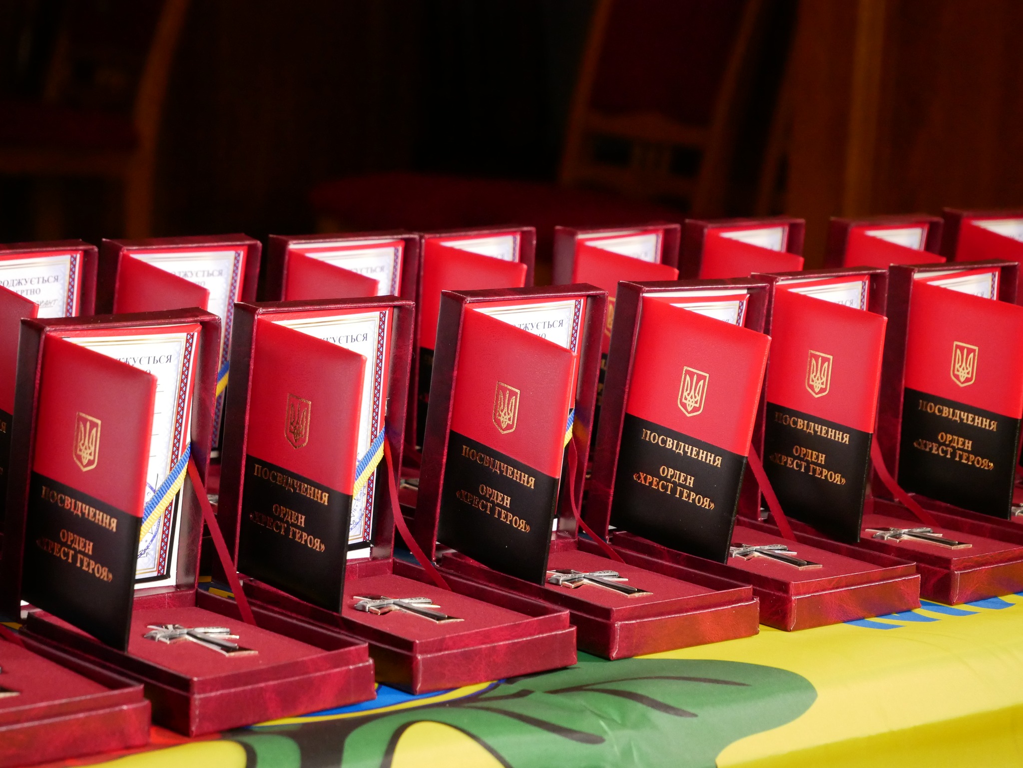 Нагороди отримали сім’ї військових, які загинули у 2022 році під час теракту в Оленівці, а також родини бійців полку «Азов» та 61-ї окремої механізованої бригади.