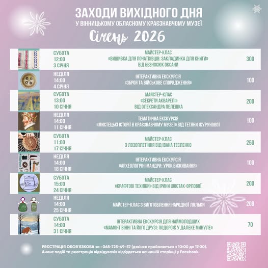 Вінницький обласний краєзнавчий музей розпочинає 2026 рік із насиченої культурно-освітньої програми. Упродовж січня на відвідувачів чекають тематичні майстер-класи та пізнавальні екскурсії, розраховані як на дітей і підлітків, так і на дорослу аудиторію.