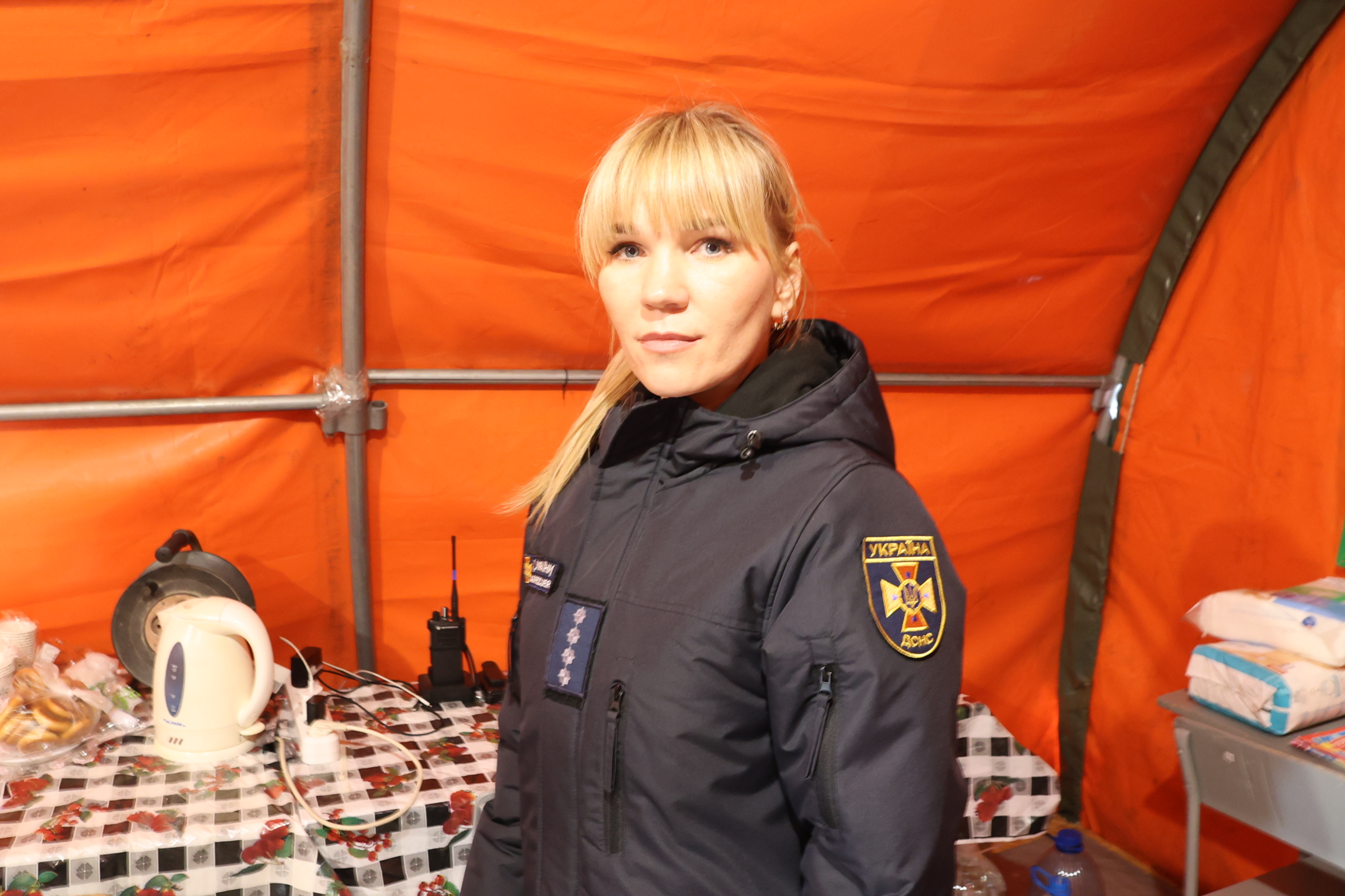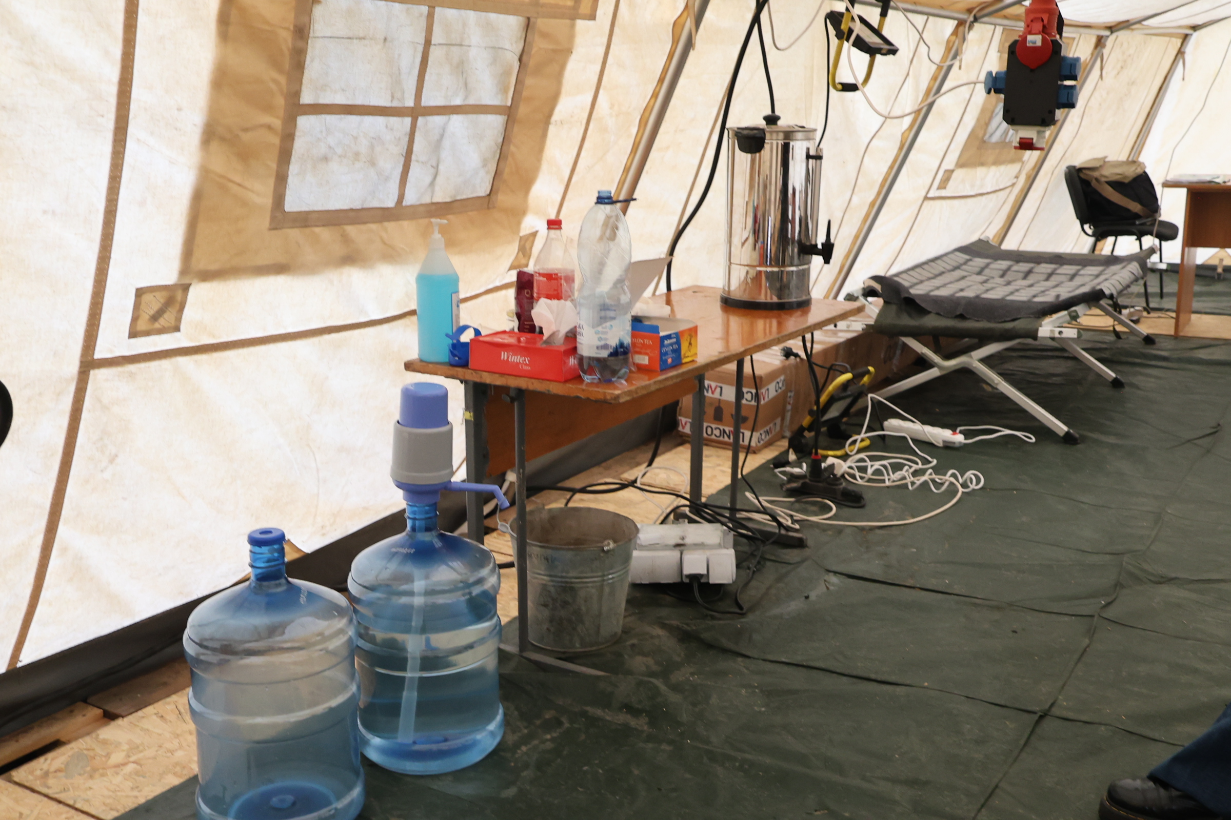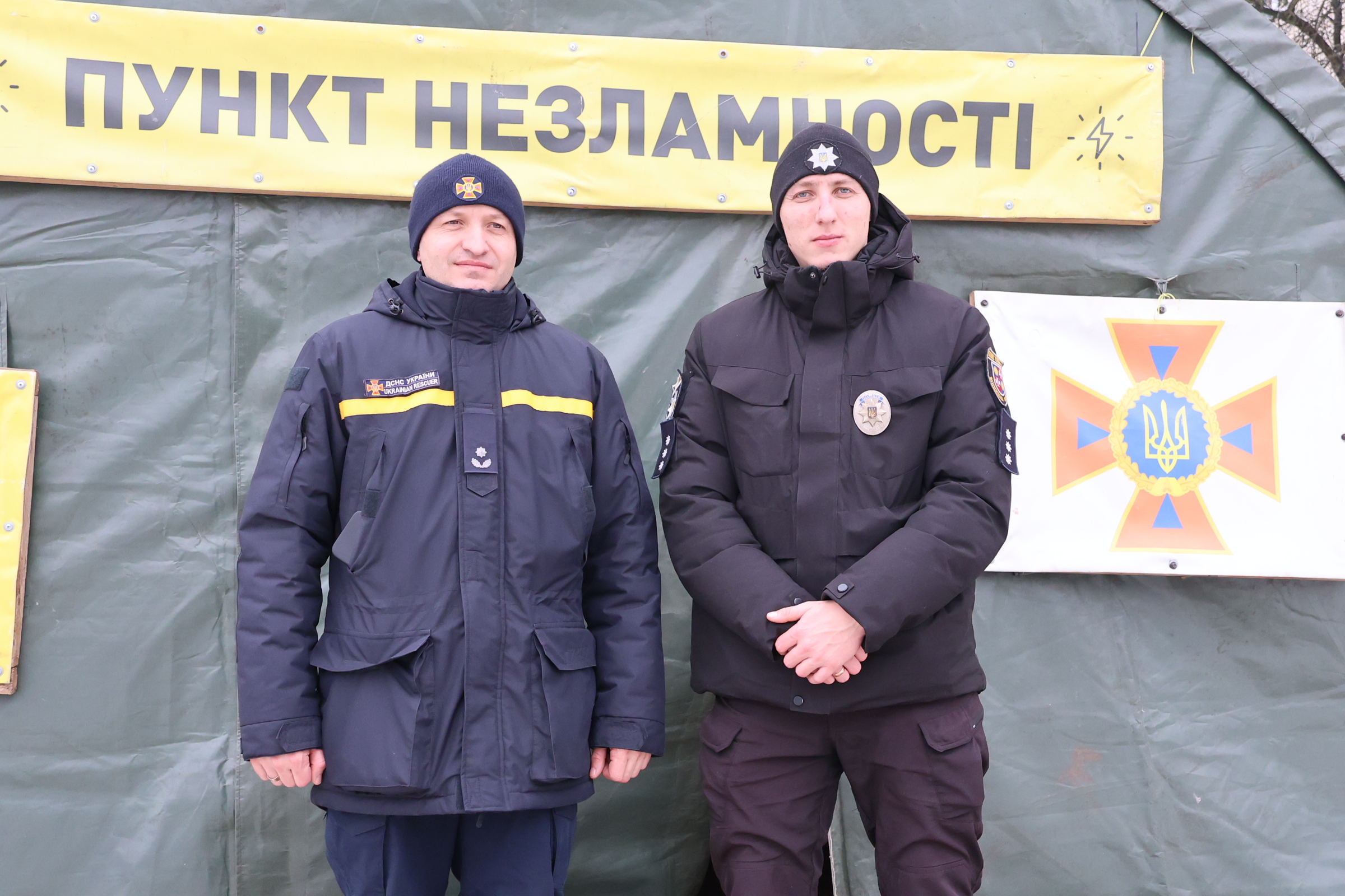 Першим у нашій подорожі став Пункт незламності на вулиці Андрія Первозванного — намет ДСНС. Тут цілодобово чергують рятувальники та поліцейські. Усередині дуже тепло — настільки, що верхній одяг доводиться знімати.