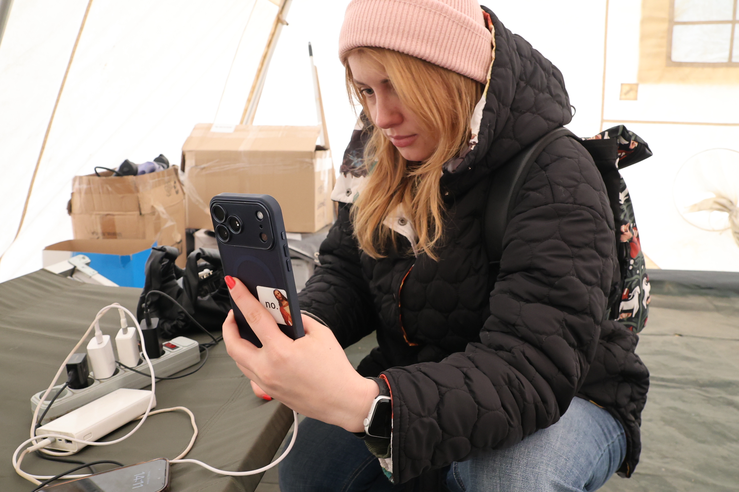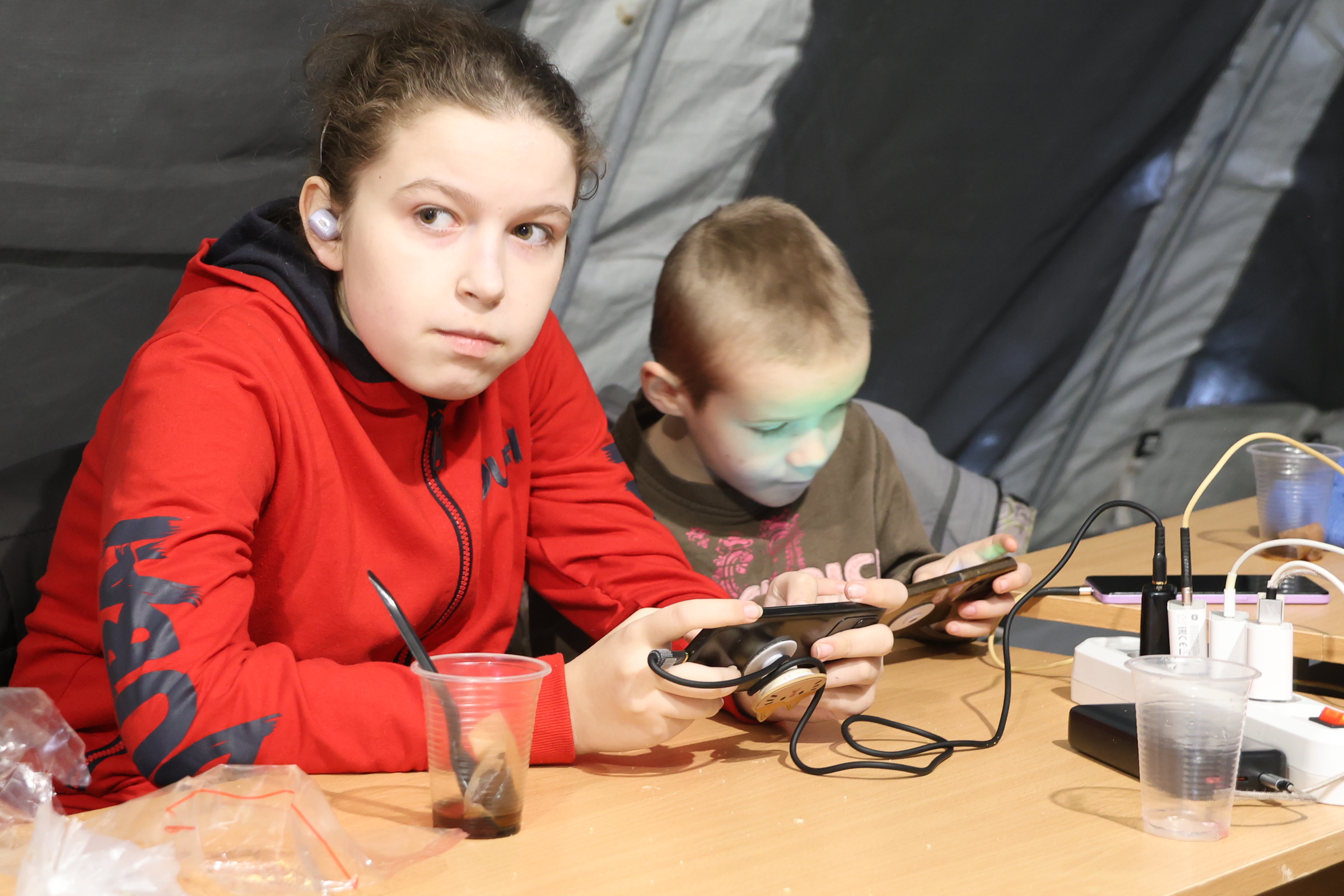 У Пункті незламності на вулиці Сергія Зулінського, розгорнутому ДСНС, — справжній аншлаг. Найбільше тут дітей, які прийшли зарядити мобільні телефони та павербанки.