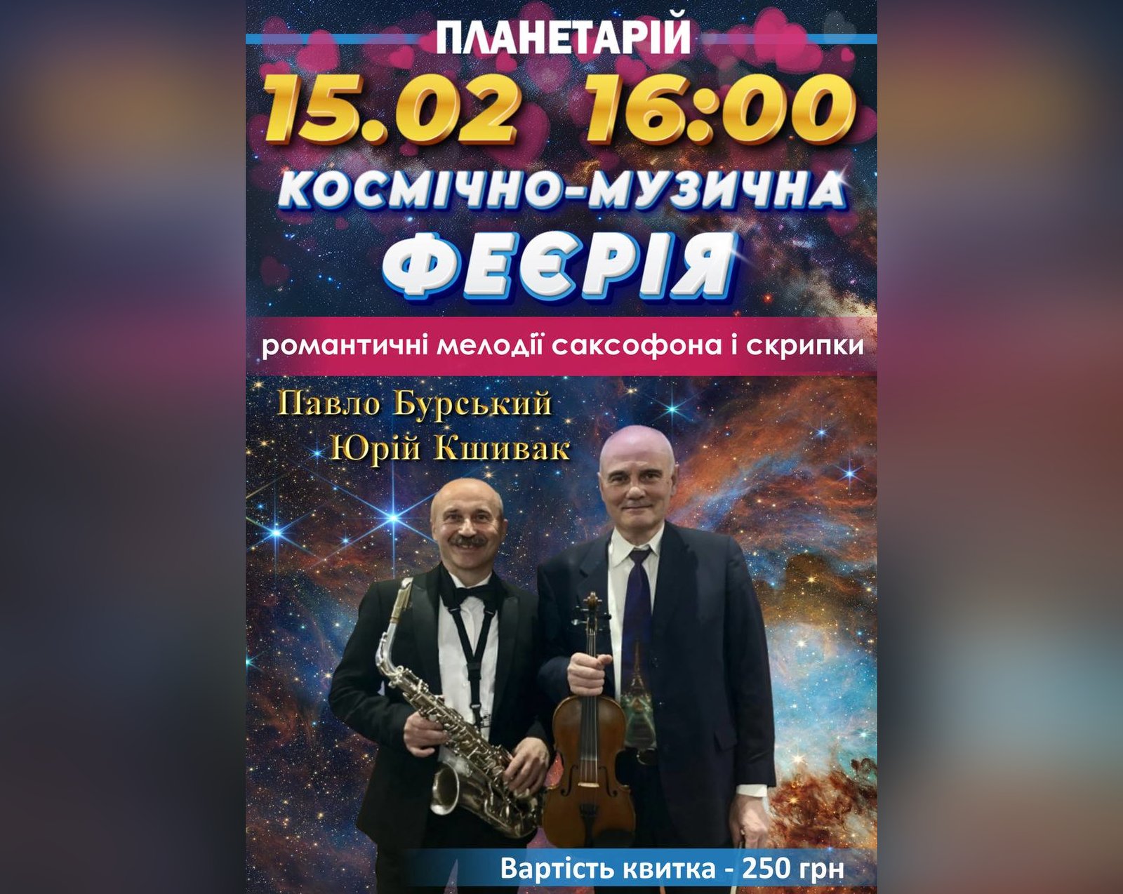 Музичний вечір присвячений Дню закоханих. Організатори зазначають, що це чудова нагода провести час із коханою людиною, родиною або друзями, відпочити від щоденної метушні та відчути гармонію музики й космосу.