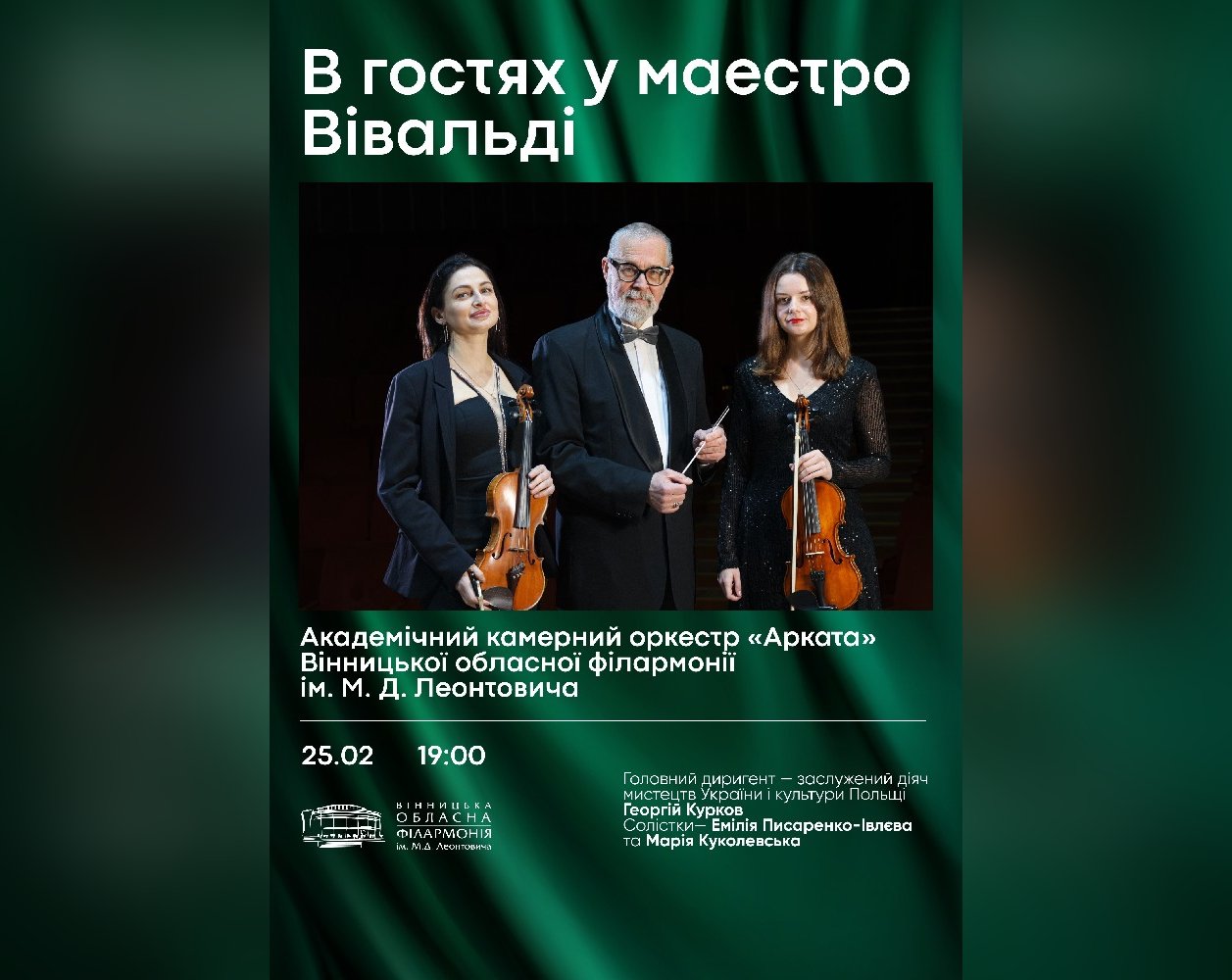 25 лютого о 19:00 у концертній залі Вінницької обласної філармонії ім. М. Д. Леонтовича відбудеться концерт «В гостях у маестро Вівальді». Глядачів запрошують у музичну подорож світом гармонії, пристрасті та витонченості, якими сповнена творчість великого італійського композитора.