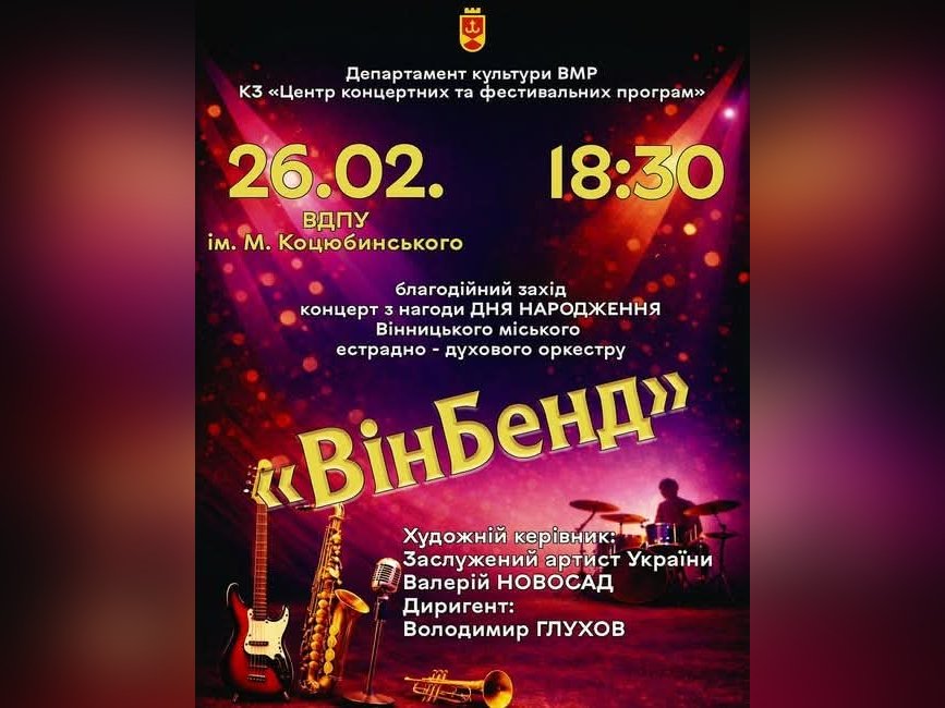 26 лютого о 18:30 у залі Вінницького державного педагогічного університету імені Михайла Коцюбинського відбудеться благодійний концерт муніципального оркестру «ВінБенд». Захід приурочений до 18-річчя колективу.