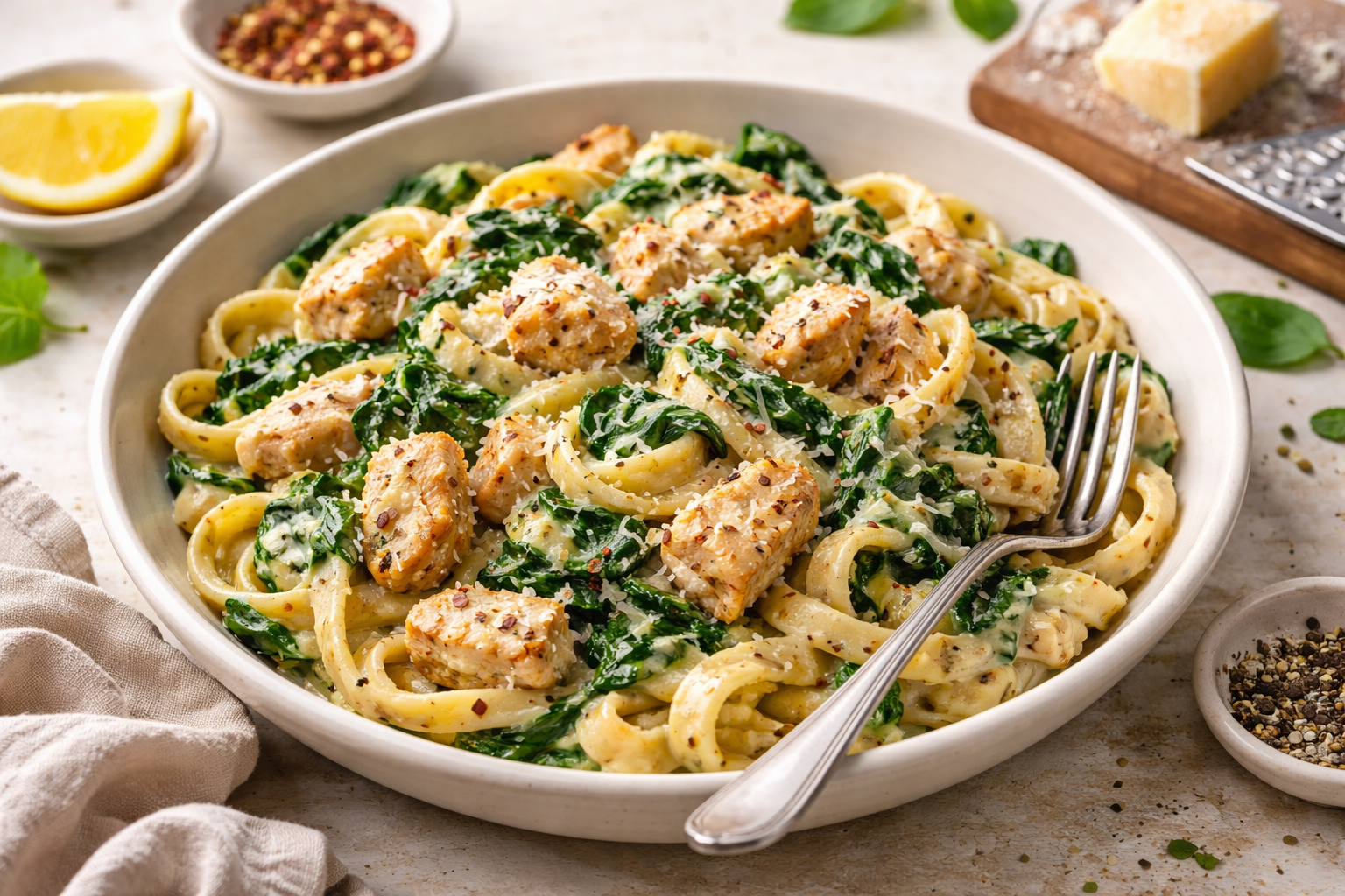 Ніжна, ароматна й водночас проста страва, яка підійде і для швидкої вечері, і для затишного домашнього обіду. Поєднання вершкового соусу, курячого філе та свіжого шпинату створює збалансований смак без зайвої складності.