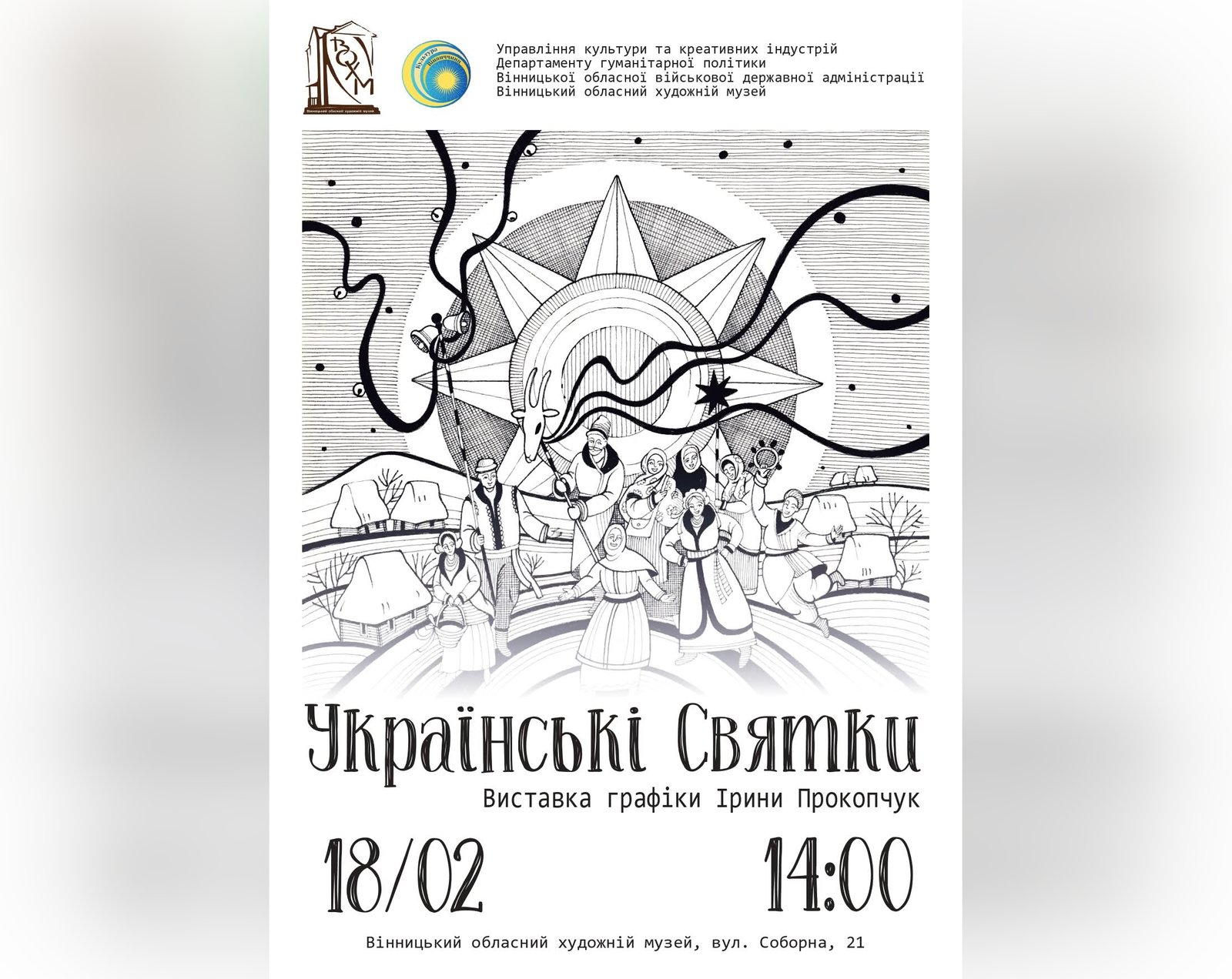 18 лютого о 14:00 у Вінницькому обласному художньому музеї відбудеться відкриття персональної виставки художниці Ірини Прокопчук «Українські святки». Про це повідомили на сторінці музею.