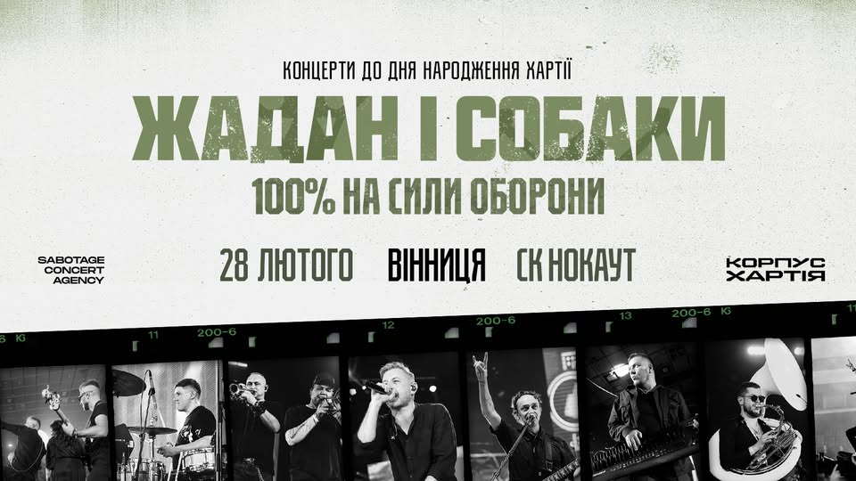 28 лютого у Вінниці відбудеться концерт гурту Жадан і Собаки. Музиканти зіграють у СК «Нокаут» у межах всеукраїнського «Хартія туру».