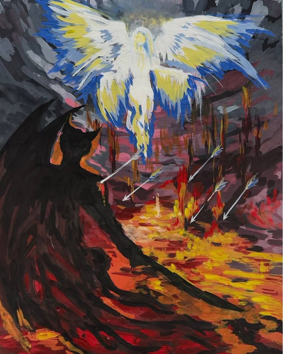 У малюнках домінують символічні образи: янголи-охоронці, воїни світла, Богородиця як символ материнського захисту, українські захисники у боротьбі зі злом. Контрастні кольори й експресивні мазки підсилюють драматизм, а поєднання темних і світлих тонів створює відчуття надії. Через мистецтво діти висловлюють вдячність оборонцям і демонструють внутрішню незламність.