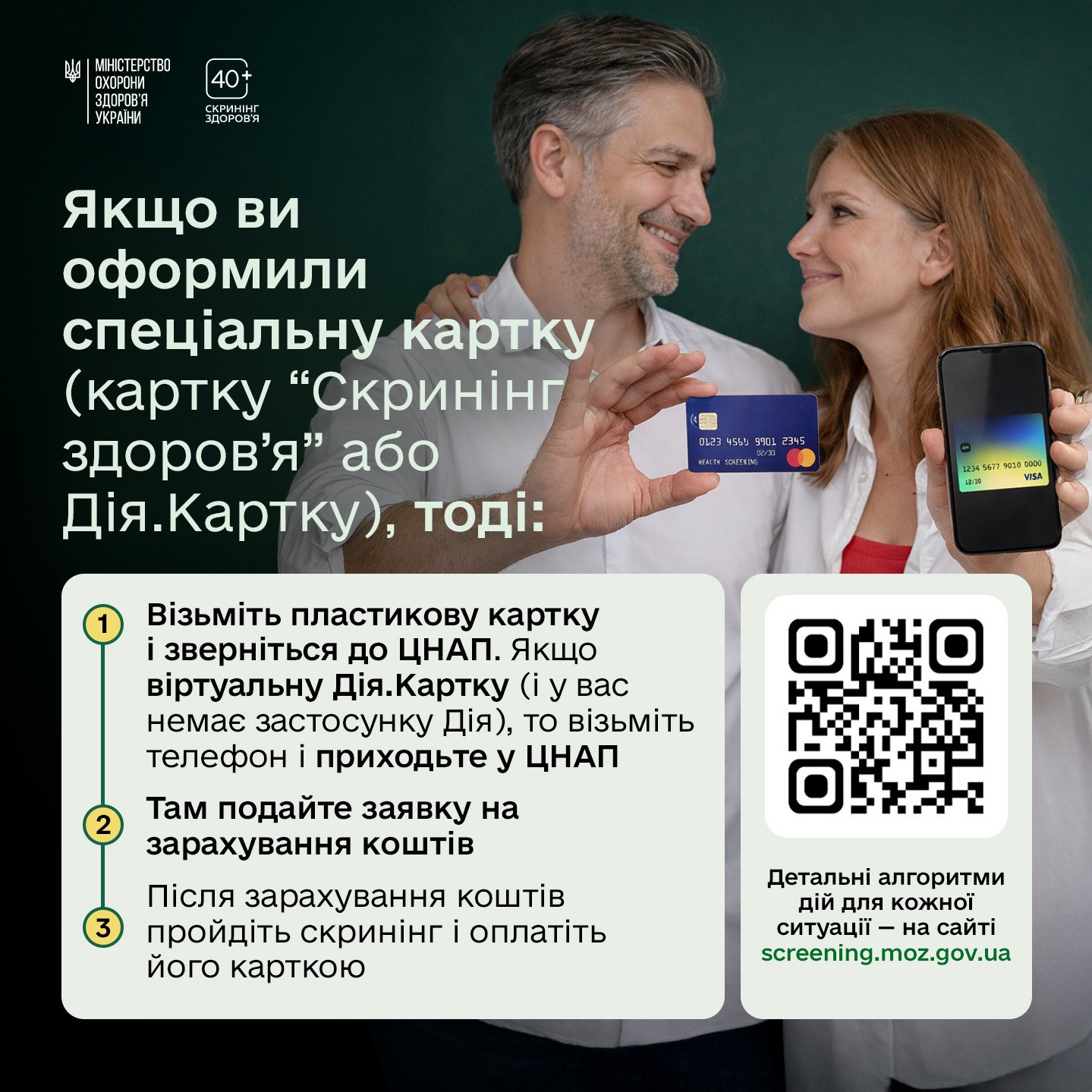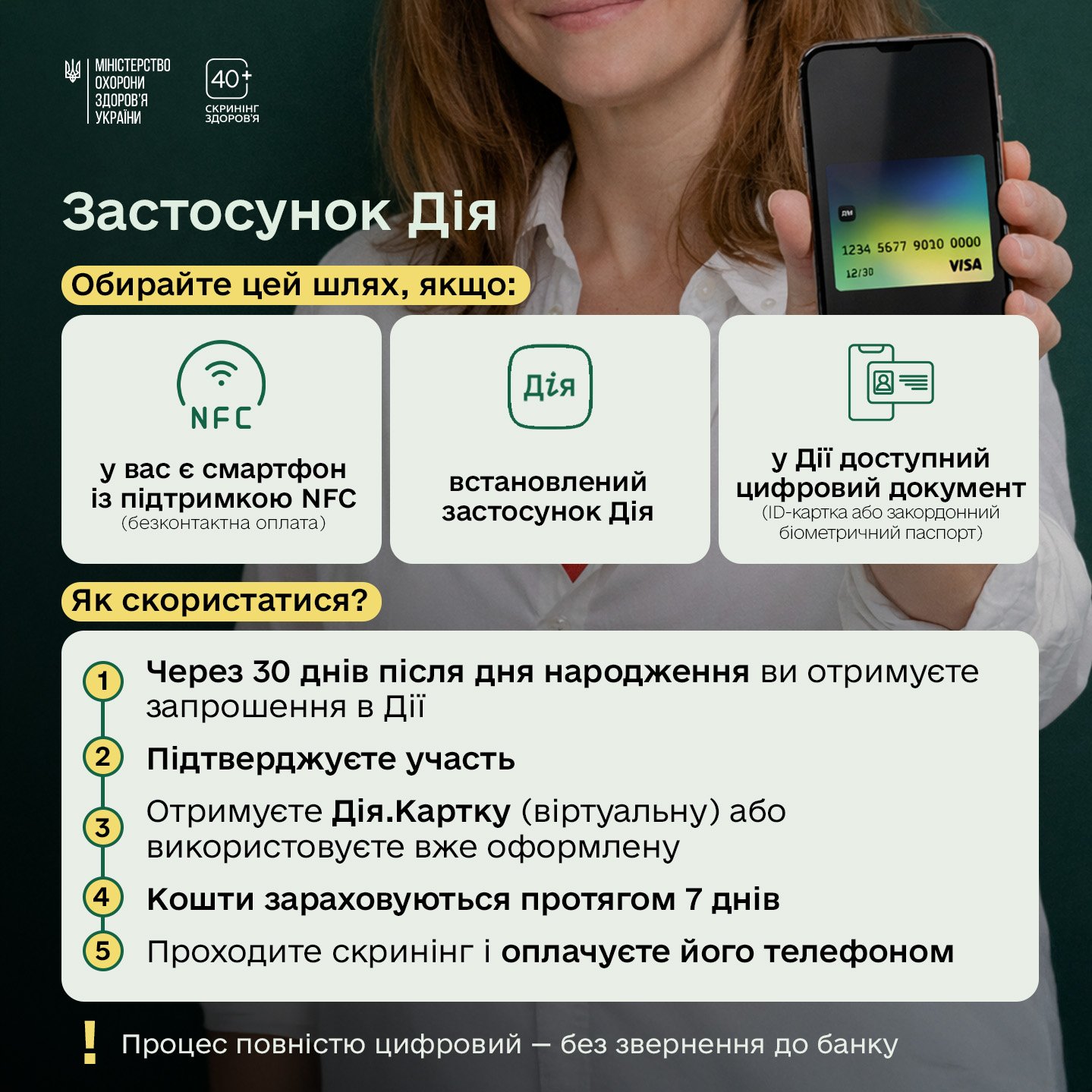 Національна програма «Скринінг здоров’я 40+» стає доступнішою. Мета проєкту — раннє виявлення серцево-судинних захворювань, цукрового діабету та розладів ментального здоров’я серед українців віком від 40 років. Кожен учасник програми отримує від держави 2000 гривень на проходження необхідних медичних обстежень.