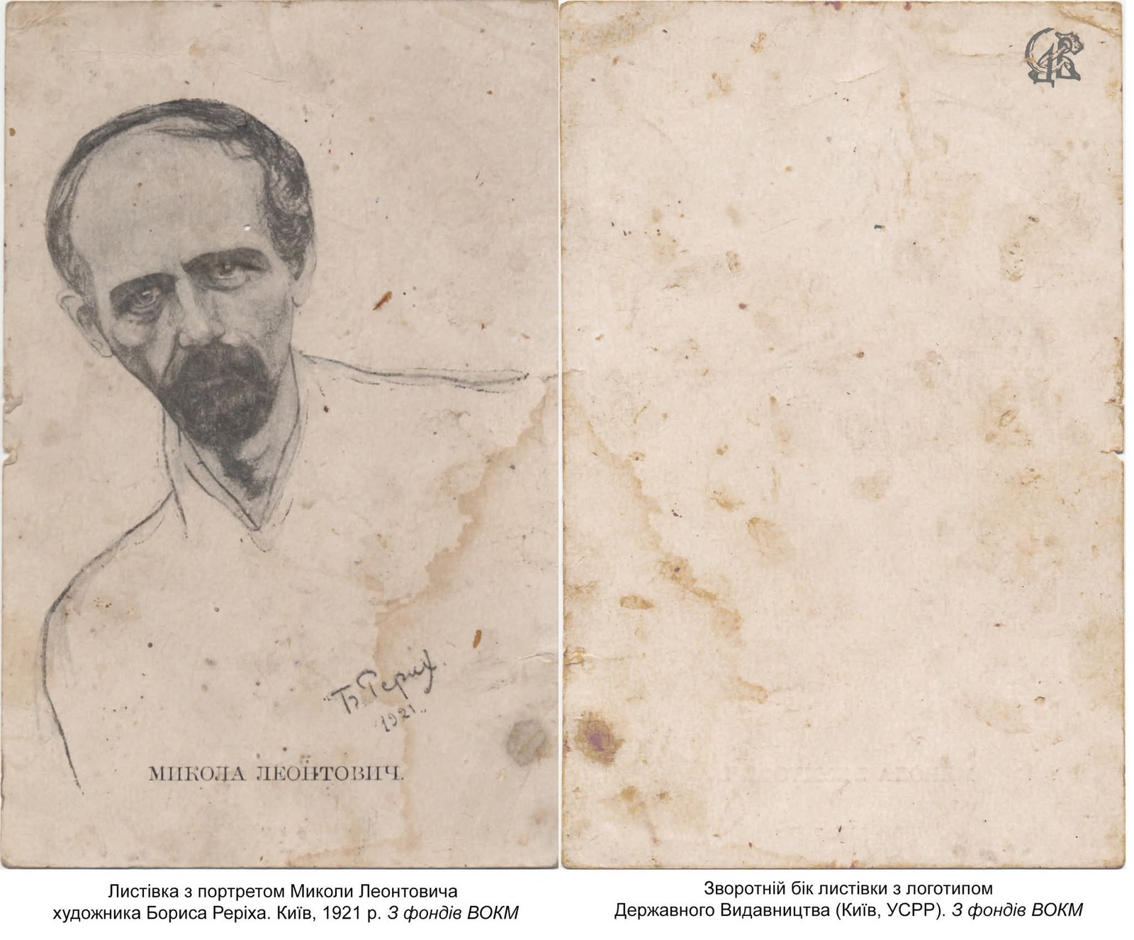 Йдеться про чорно-білу листівку розміром 16,5×10,5 см із поясним портретом композитора, виконаним художником Борисом Реріхом у 1921 році. На звороті збережено логотип Державного видавництва УСРР, що підтверджує її походження.