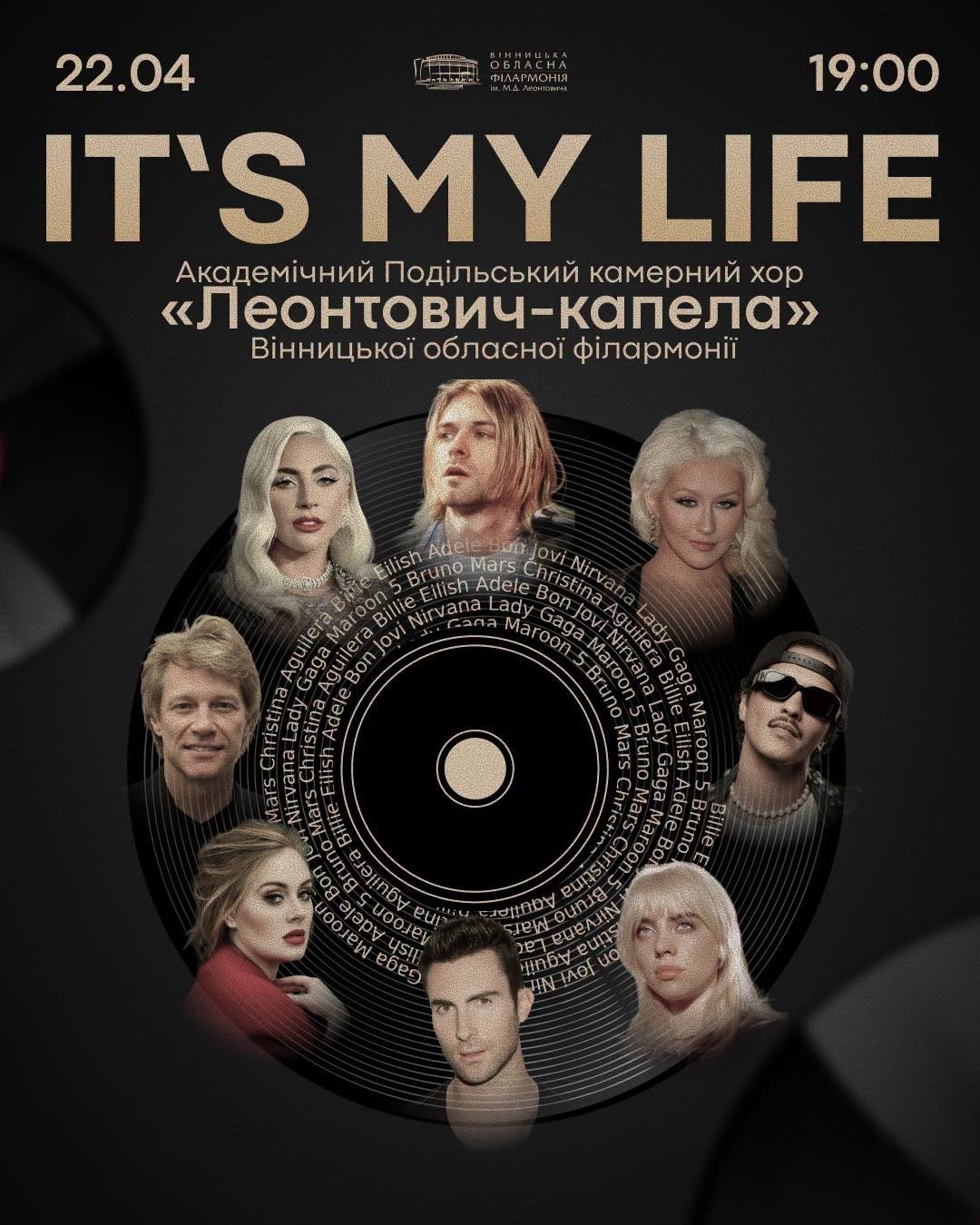 Однією з головних музичних подій стане виступ Академічного Подільського камерного хору «Леонтович-капела», який відбудеться 22 квітня о 19:00 у Вінницькій обласній філармонії. Програма «It’s my life» об’єднає відомі світові хіти у новому хоровому звучанні. У репертуарі — композиції Adele, Billie Eilish, Michael Jackson, Bon Jovi, Lady Gaga, Nirvana та Maroon 5, що прозвучать у живому виконанні без фонограми.