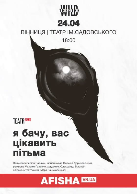Театральна афіша тижня також насичена прем’єрами. 24 квітня на сцені Вінницького академічного музично-драматичного театру ім. Миколи Садовського «Дикий театр» у співпраці з Національним театром ім. Марії Заньковецької представить виставу «Я бачу, вас цікавить пітьма» за романом Ілларіона Павлюка. Психологічний трилер розповідає історію кримінального психолога, який розслідує зникнення дитини у віддаленому селищі, де панують страх і байдужість.